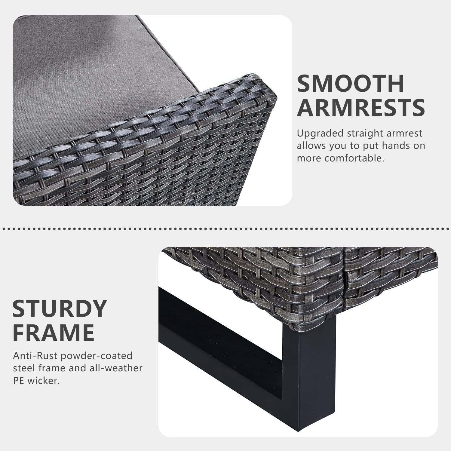 - 【Upgrated Elegant Design Sturdy&Durable】All made with Anti-Rust powder-coated steel frame and All-weather Hand-Woven PE wicker to make this patio furniture set is resistant to UV and weather,The patio conversation sets is totally upgraded with straight armrest and the heightened ergonomically curved backrest.