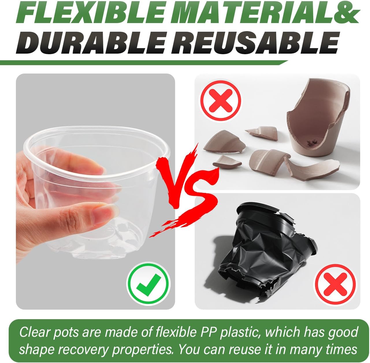 - 【Quality Plastic】Made of top grade plastic, no recycle material added, it can be repeat use for many times. The edge of the pots are sturdy enough for you to carry pots by one hand, two fingers.