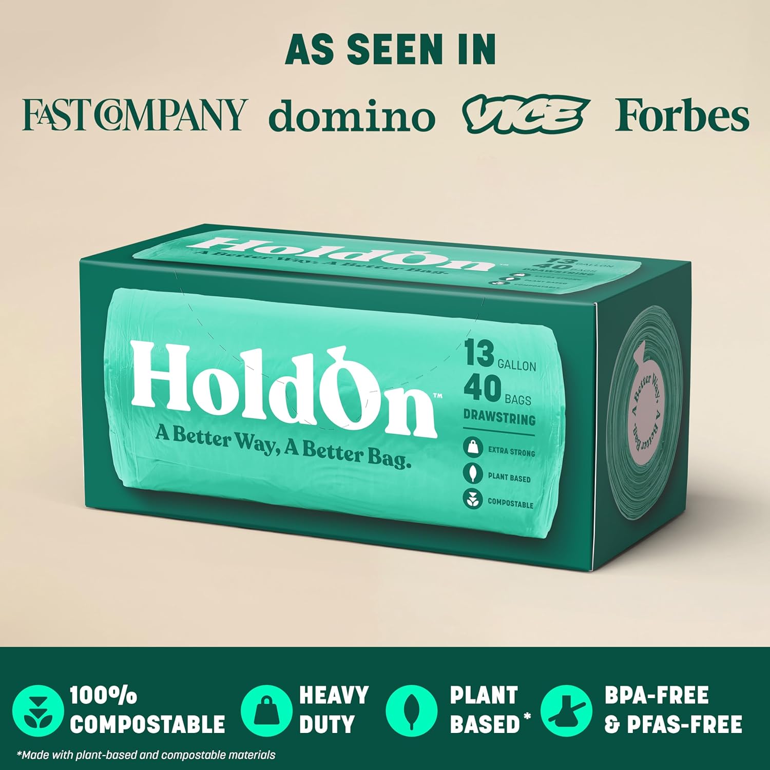 HoldOn 13-Gallon Trash Bags – Tall Kitchen Trash Bags with Drawstring Handles for Tall Trash Bins, Heavy-duty and Compostable, Large Trash Bags (40 bags, Pack of 2)