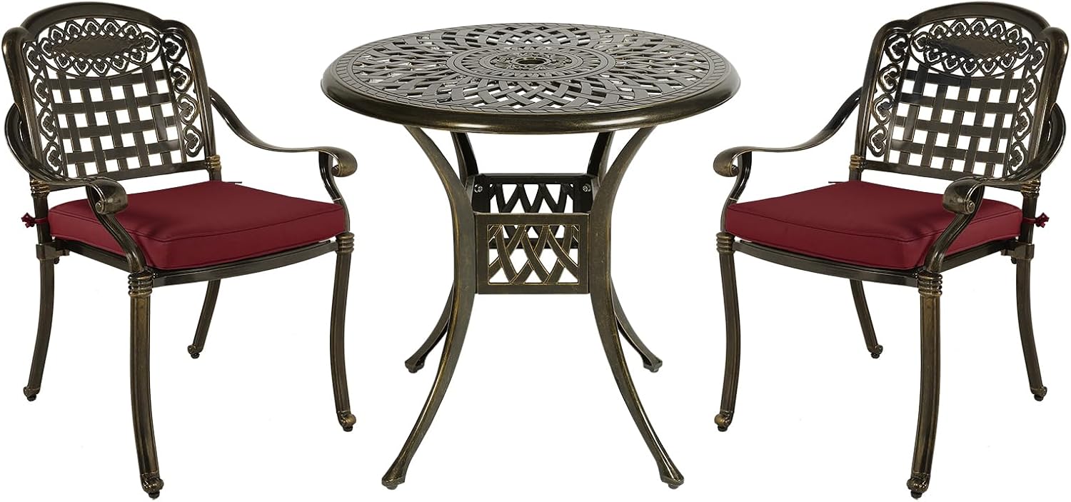 MEETWARM 3 Piece Patio Bistro Set, Outdoor All-Weather Cast Aluminum Dining Furniture Set Includes 2 Chairs with Cushions and a 31” Round Table with Umbrella Hole for Garden Deck, Chili Red
