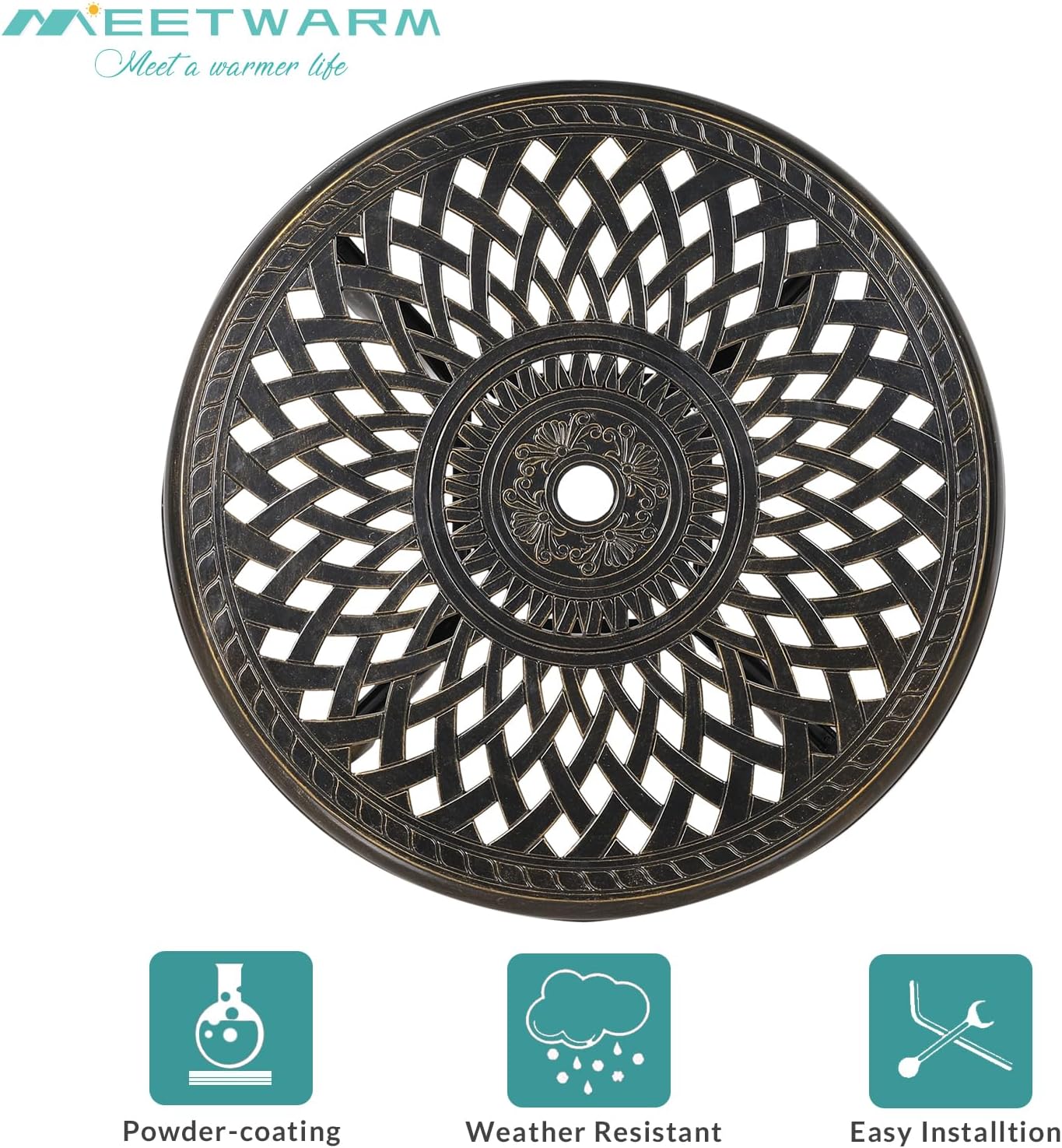 - 【Weather Resistant】 - At MEETWARM, we bring you the best outdoor furniture available. Our table and chairs are made of sturdy and durable cast aluminum with rust-resistant powder coated surface for years of outside use. If you use this set by the pool, its all-weather quality helps prevent water damage caused by wet swimsuits and splashing