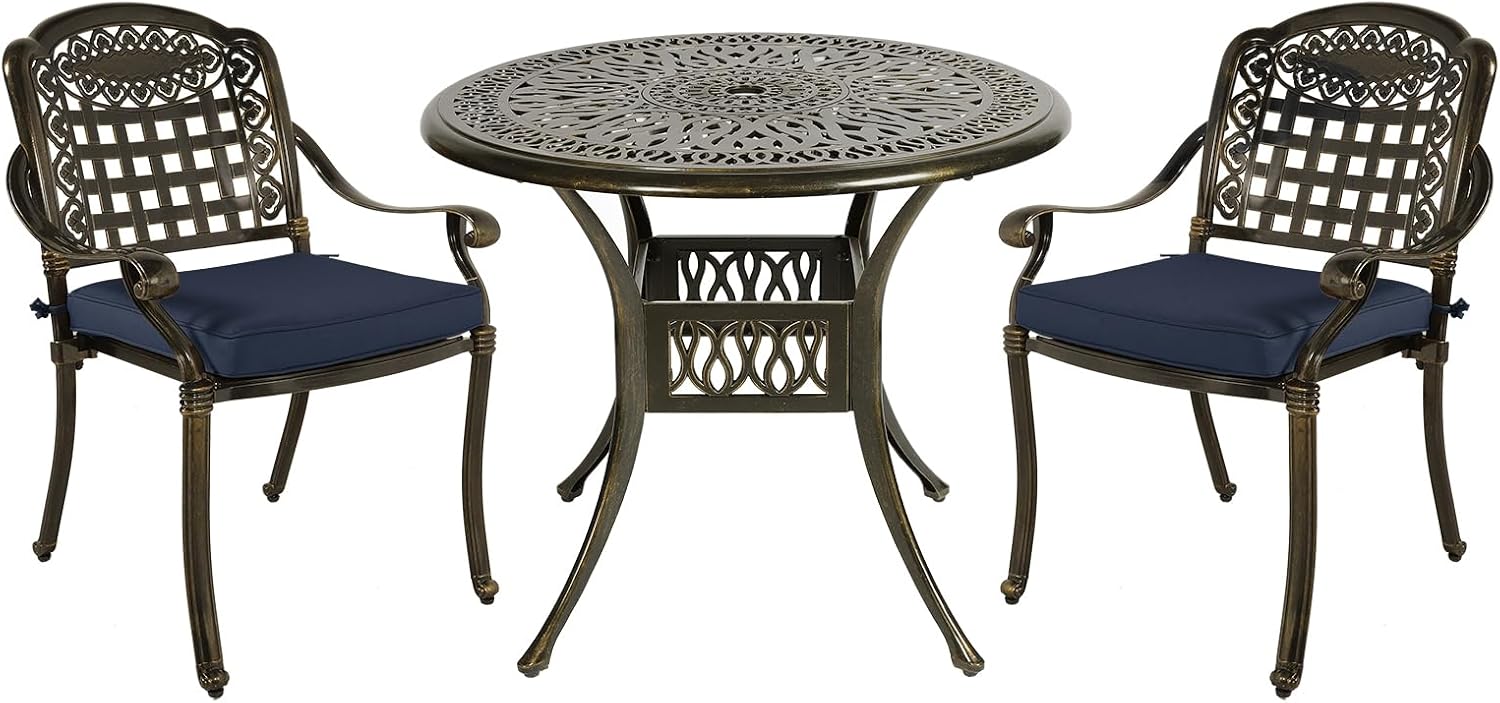 MEETWARM 3 Piece Patio Bistro Set, Outdoor All-Weather Cast Aluminum Dining Furniture Set Includes 2 Chairs with Cushions and a 35.4” Round Table with Umbrella Hole for Garden Deck, Navy Blue