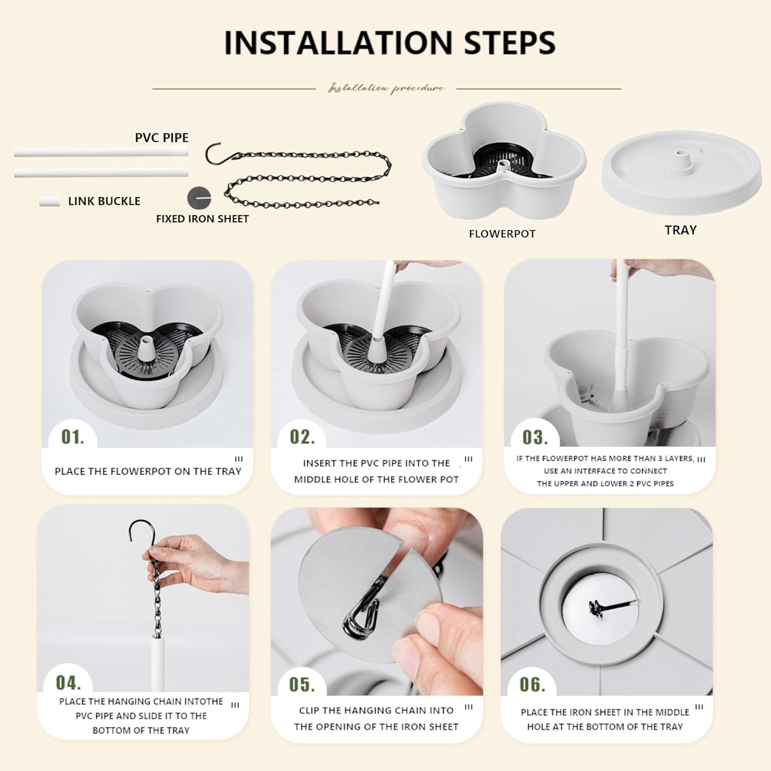 - Simplified Gardening: Each pod is 13 x 5.1 Inch (LXH), and the tray height is 3.54 Inch(H), filter tray is 12 Inch, and total height is 2.52 FT(H), iron chain is 37.5 inch.This planter allows for versatile stacking options: 2, 3, or even 4 tiers high. Additionally, it can be suspended using chains or positioned on a cylindrical pole.
