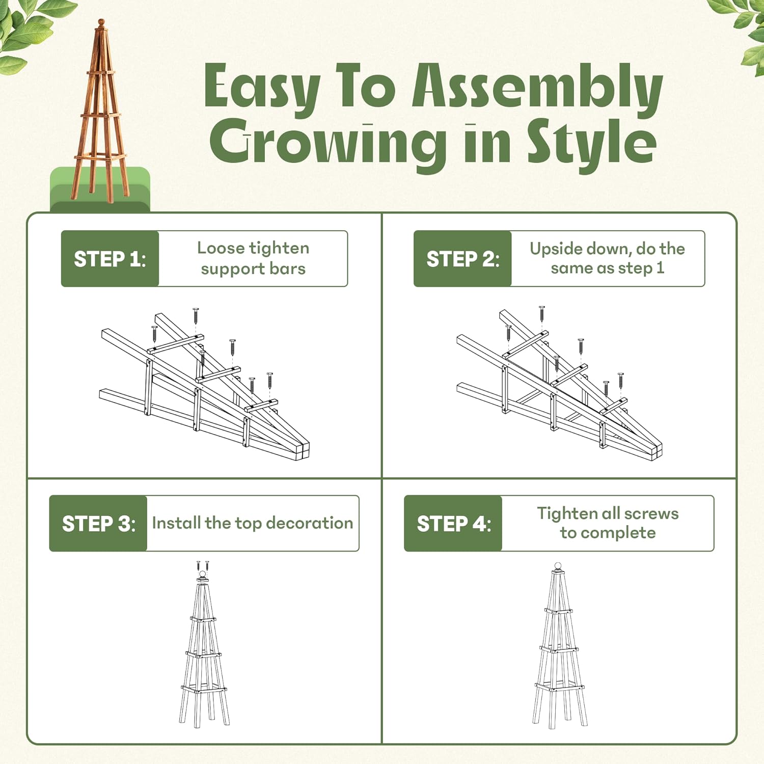 - π DECORATIVE AND ELEGANT DESIGN: The classic obelisk structure of this plant trellis adds style and function to gardens, patios, and balconies; An indoor plant trellis enhances dΓ©cor while providing sturdy support for plants