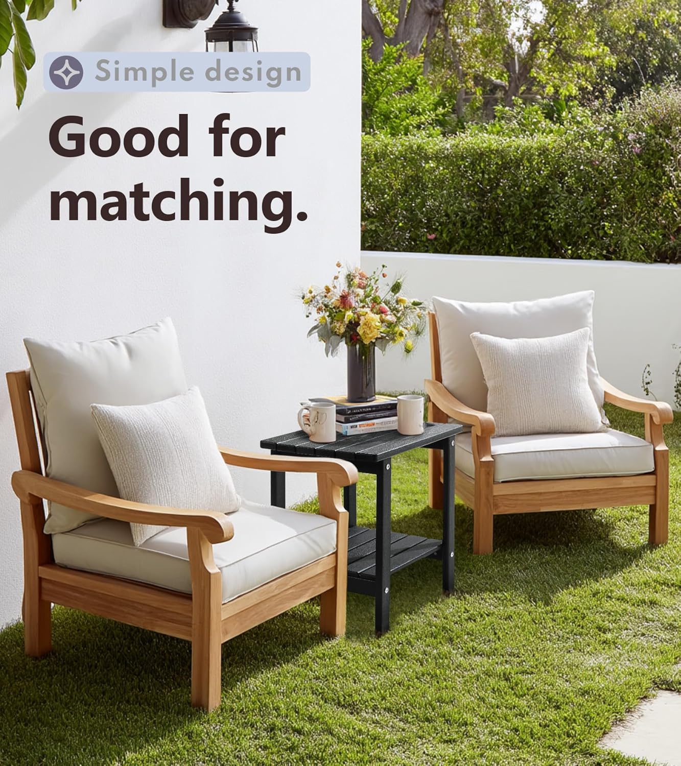 - ăDurable Material & Weather ResistantăThe patio side table are made of sturdy and waterproof material HDPE, which is more weather resistant. The outdoor side tables can withstand a range of severe weather conditions like burning sun, strong wind or heavy rain yet retain the original color for years to come, never fade, rust, peel and rot.