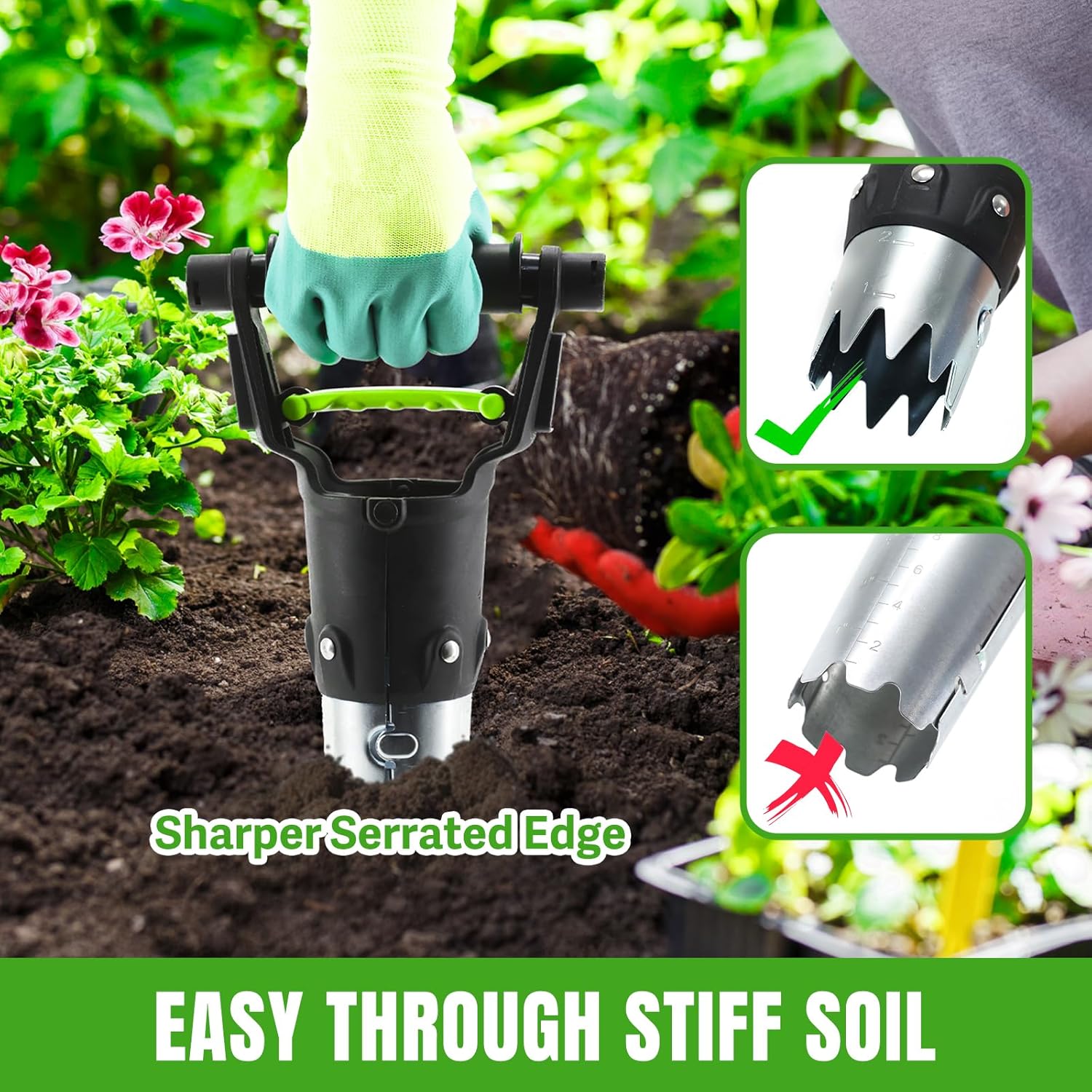 - BENDING-PROOF MATERIAL: The bottom section of the flower bulb planter tool is constructed from steel, featuring sharper serrations compared to others, allowing it to easily penetrate hard soil. The electoplating surface ensures resistance to rust and corrosion. The upgraded and enlarged diameter makes it a good planter tool.