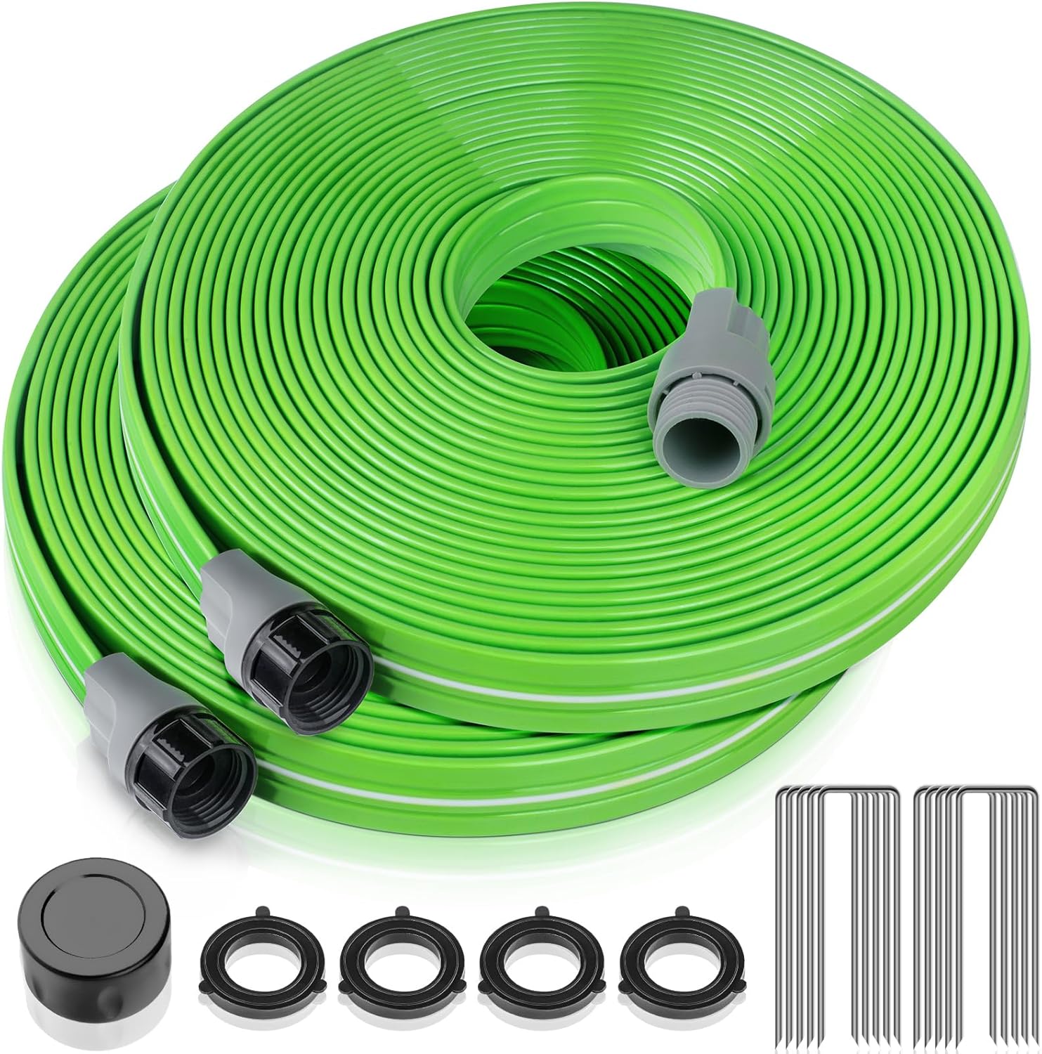 - What You Get: Complete Watering Set with 2 x 50FT Sprinkler Hose, 40 x Ground Stakes, 1 x Instruction Manual. Simply lay out the hose, turn on the valve, and enjoy hands-free watering.