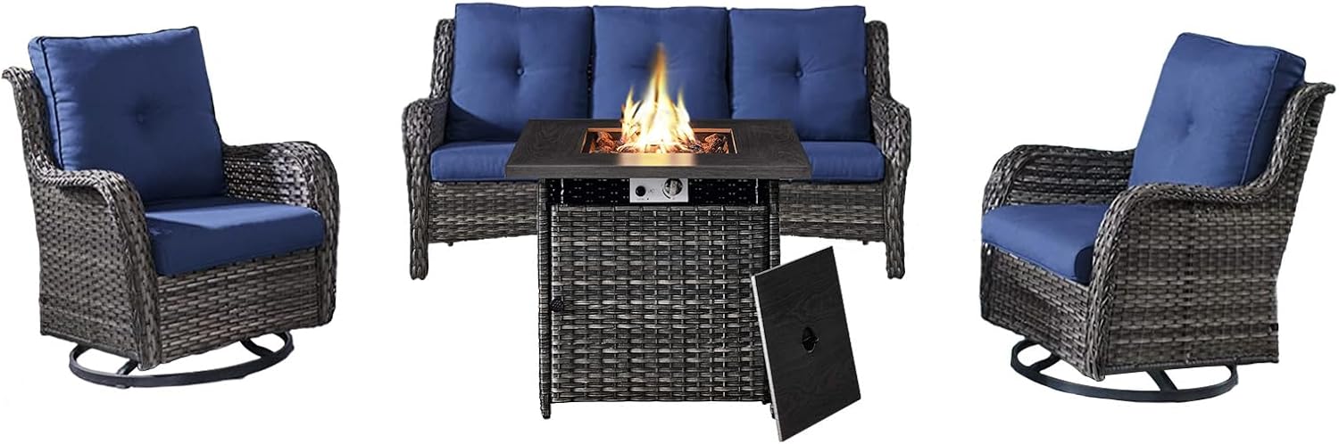 Outdoor Patio Furniture Set with 50000BTU Propane Fire Pit Table, 4 Pieces Wicker Patio Conversation Set with 2 Swivel Rocker Glider Chairs Rattan Sofa Blue Cushion Perfect for Casual Gathering