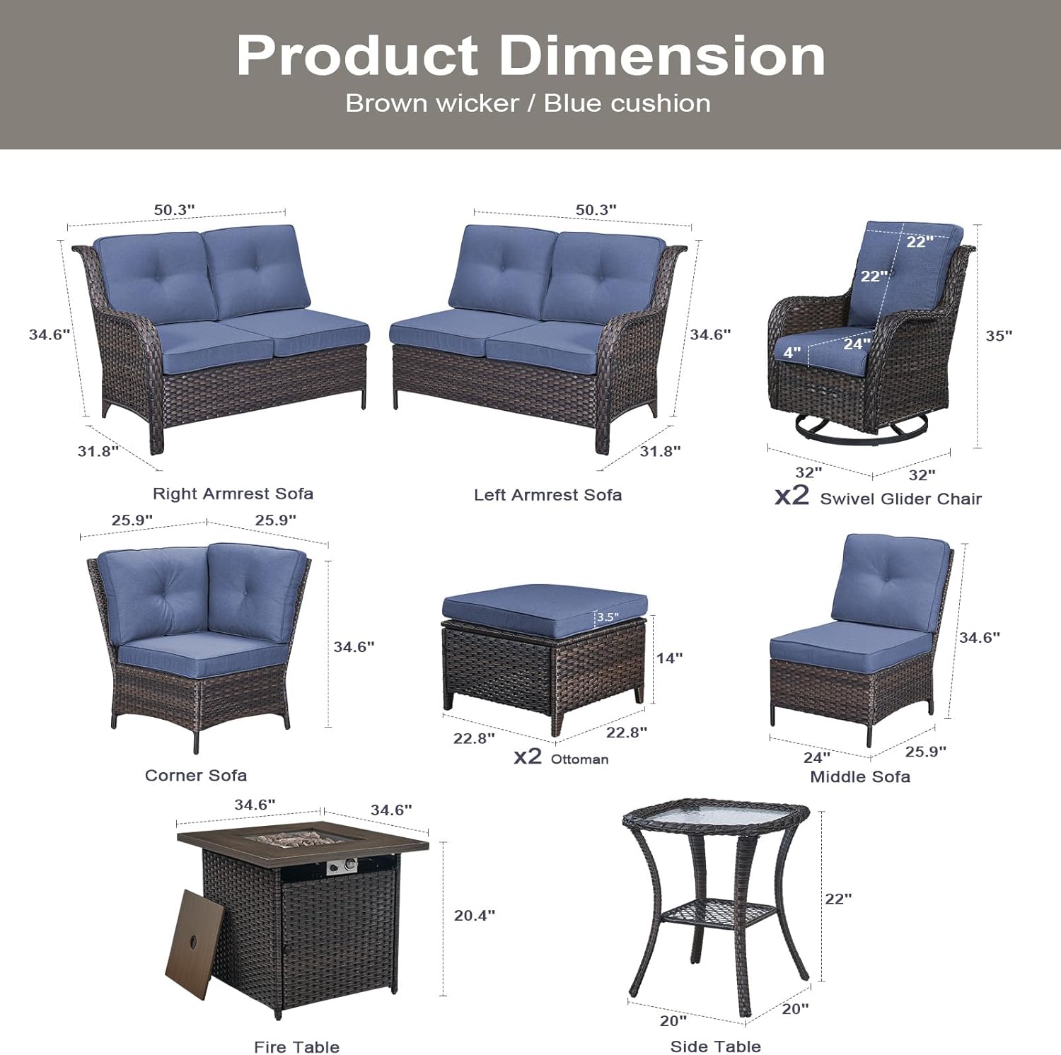 Outdoor Sectional Furniture Sofa Set with 50000BTU Propane Fire Pit Table, Wicker Patio Conversation Set with 2 Swivel Rocker Glider Chairs Blue Cushion Perfect for Backyard Casual Gathering