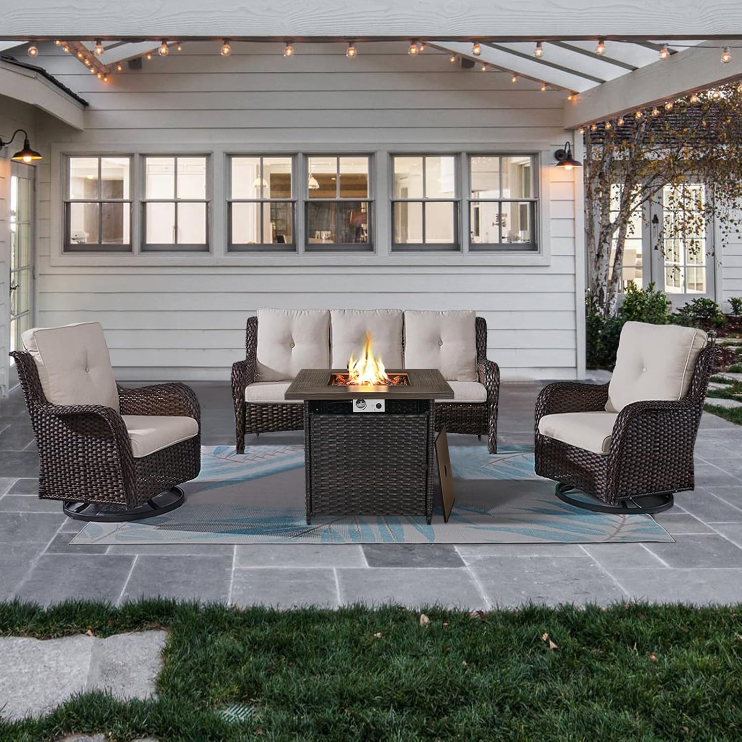Outdoor Patio Furniture Set with 50000BTU Propane Fire Pit Table, 4 Pieces Wicker Patio Conversation Set with 2 Swivel Rocker Glider Chairs Rattan Sofa Blue Cushion Perfect for Casual Gathering
