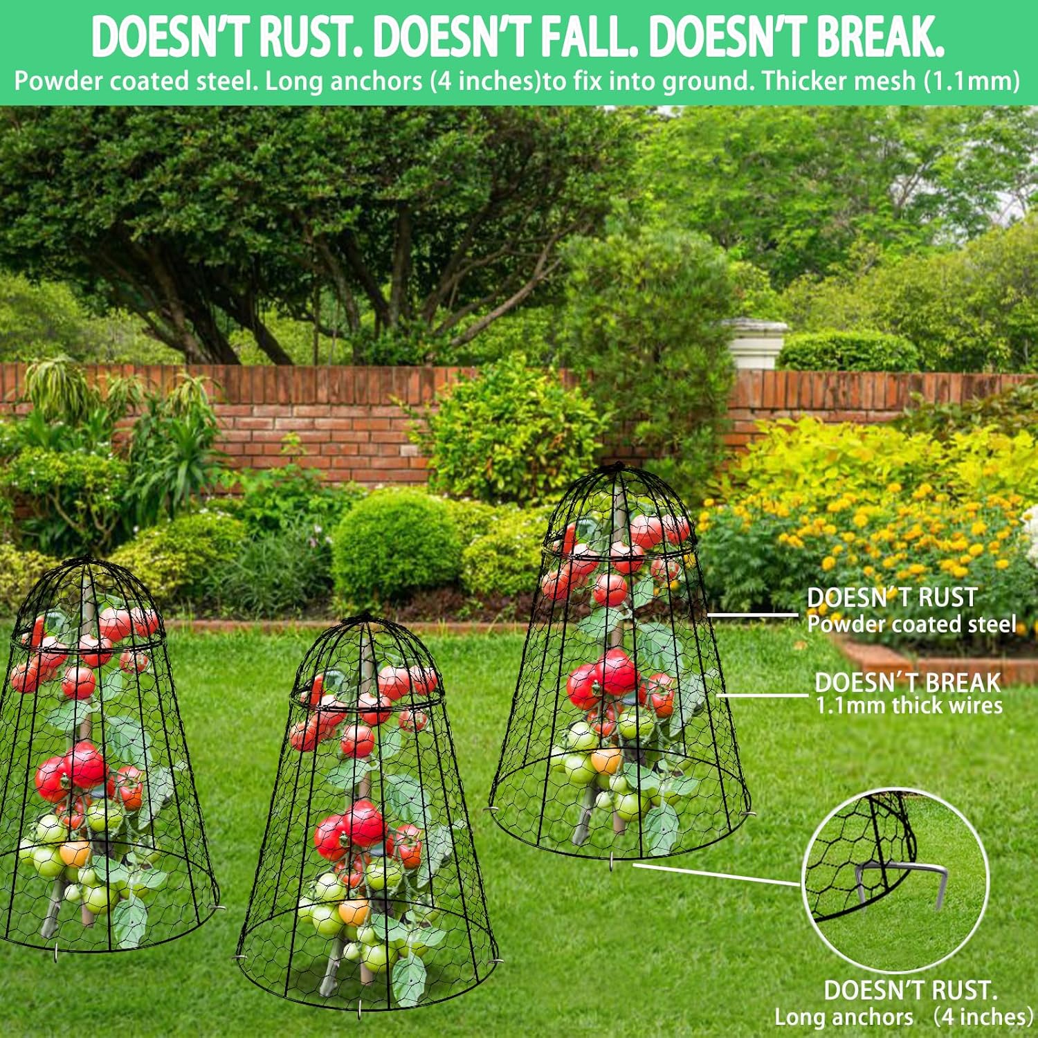 - 🌱Durable, Rust-Resistant: Sapbontchi garden cloches for plants, black metal protective covers are made of high-quality powder coated steel, ensuring a smooth surface and sturdy construction and don't rust. Our garden cloches have 4 LONG LEGS (4 inches) and DOESN'T FALL even under heavy winds. DOESN'T BREAK or DEFORM because of thicker (1.5 mm) wires. Garden cloches for plants large won't rust and can be used continuously for multiple quarters, providing long-lasting protection for your plants.
