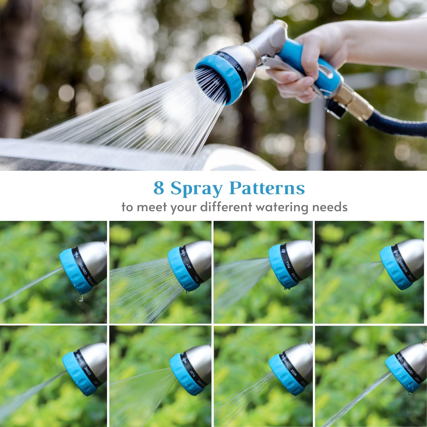 - 8 Patterns Spray Nozzle: HOSUN versatile garden hose nozzle support to meet different watering needs. Rotate the sprayer head to choose from a soft shower to high-speed jet. No matter you're watering the garden, cleaning vehicles, or giving your dog a bath, you will find a pattern that best fits your need.