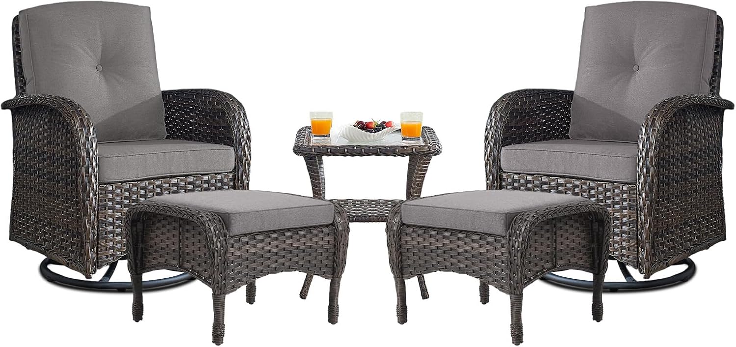 - 4.LUXURIOUS OUTDOOR RETREAT ENSEMBLE: Relax in the beautiful outdoors with this perfect 5 pieces patio furniture set. Our patio swivel rocker chair set with high quality foam cushion, comfortable and soft rebound good. The cushion cover is made of olefin outdoor water-resistant fabric. The seat and backrest are made of beautifully woven wicker coupled with ergonomic design, making it a classic upgrade for any porch, deck or patio.