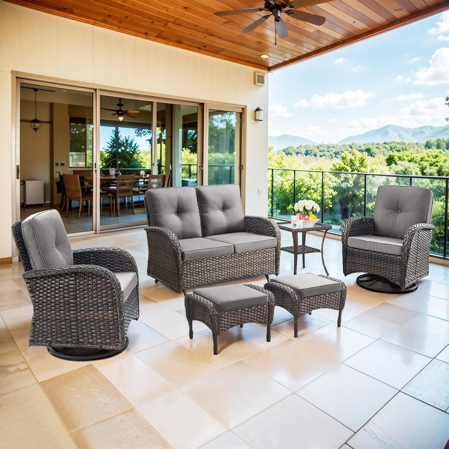 6 Piece Patio Conversation Sets - Wicker Patio Furniture Sets with Outdoor Swivel Rocker Chairs, Glider Loveseat Perfect for Patio Deck Backyard, Brown Wicker Grey Cushion