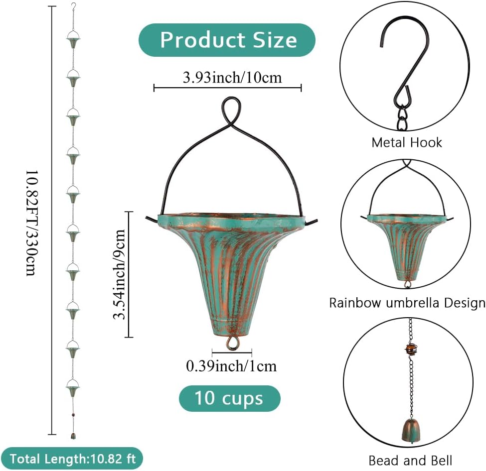 - Unique Designs: The rain chain downspouts are beautifully combined with 10 funnel -shaped cups. The bell pendant at the bottom will make a clear sound in the wind and rain, so you can hear a concert from nature on a stormy day