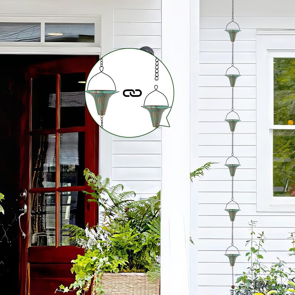 - Replacement Downspout for Gutters: The rain chain adopts a retro green funnel shape design. Rain gutter chains can not only effectively guide the flow of rainwater, but also decorate the eaves and bringing different visual effects. An elegant alternative to traditional gutter downspouts