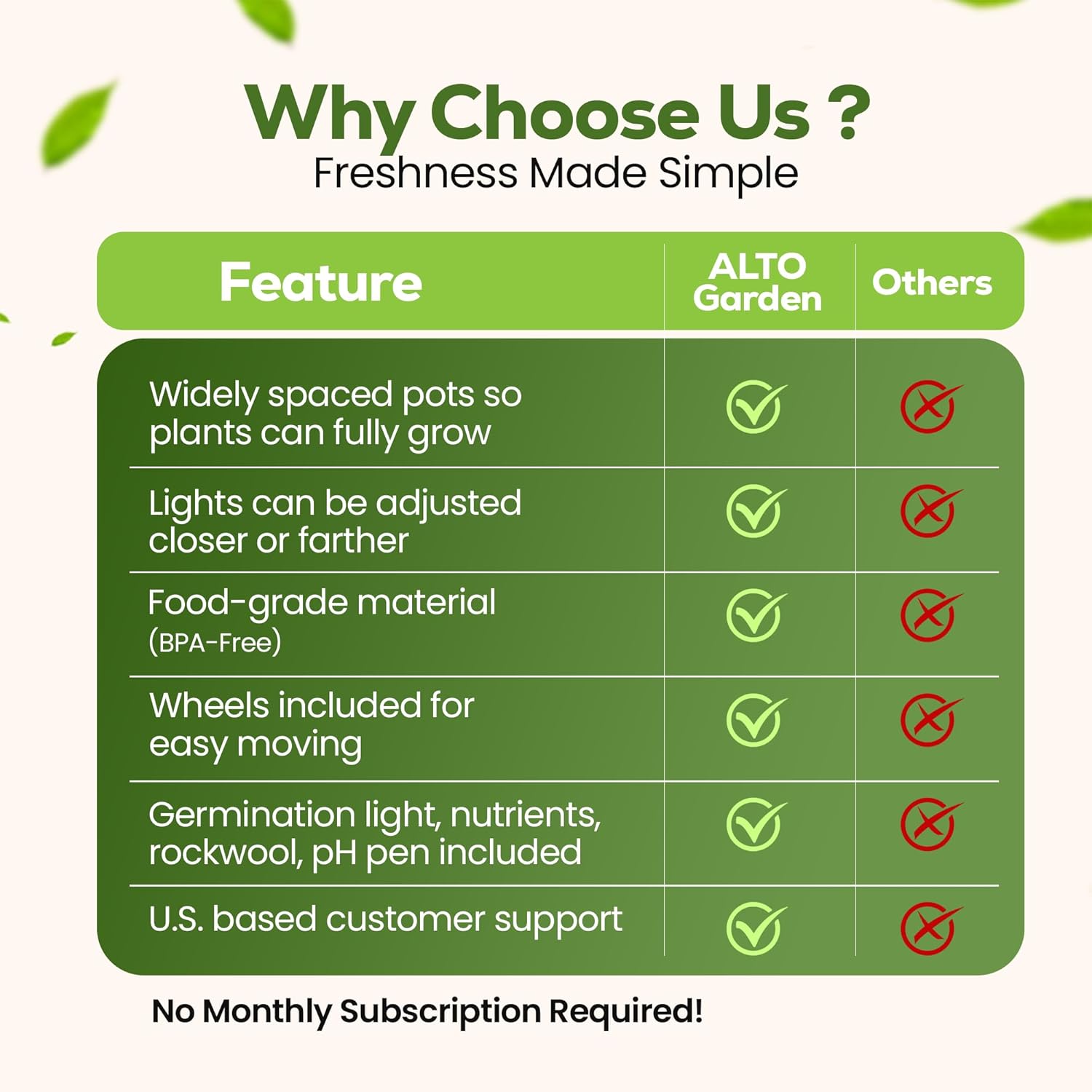 - [NO MONTHLY SUBSCRIPTION] Some brands require a monthly subscription to “unlock” the full features of their system. These fees can amount to several hundred dollars per year. With ALTO Garden, there are no hidden fees!