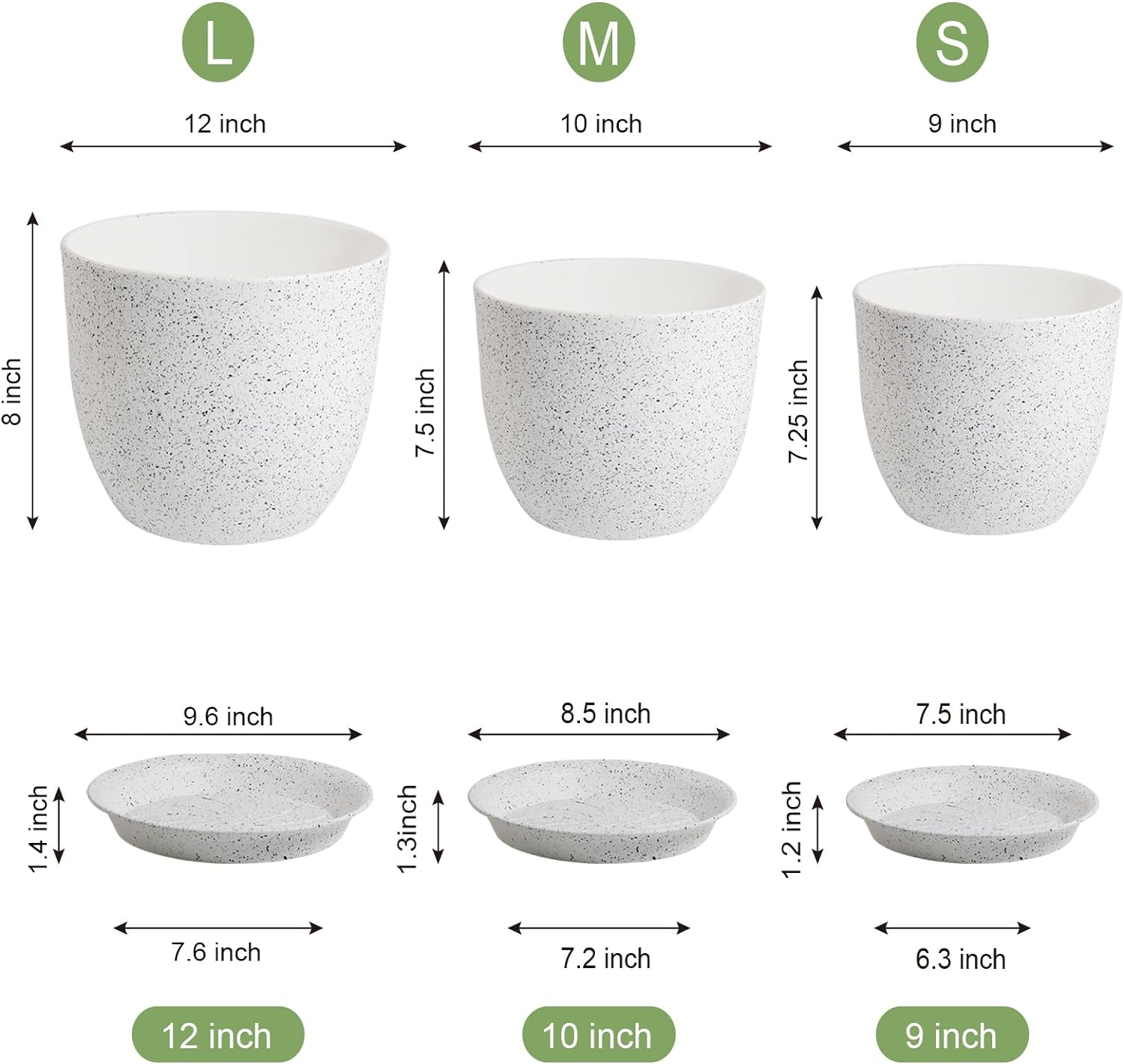 Large Flower Pots 12/10/9 inch, Set of 3 Modern Decorative Plastic Planters with Drainage Holes and Saucers for Garden House Plants, Plant Pots for Indoor Outdoor Plants, Speckled White