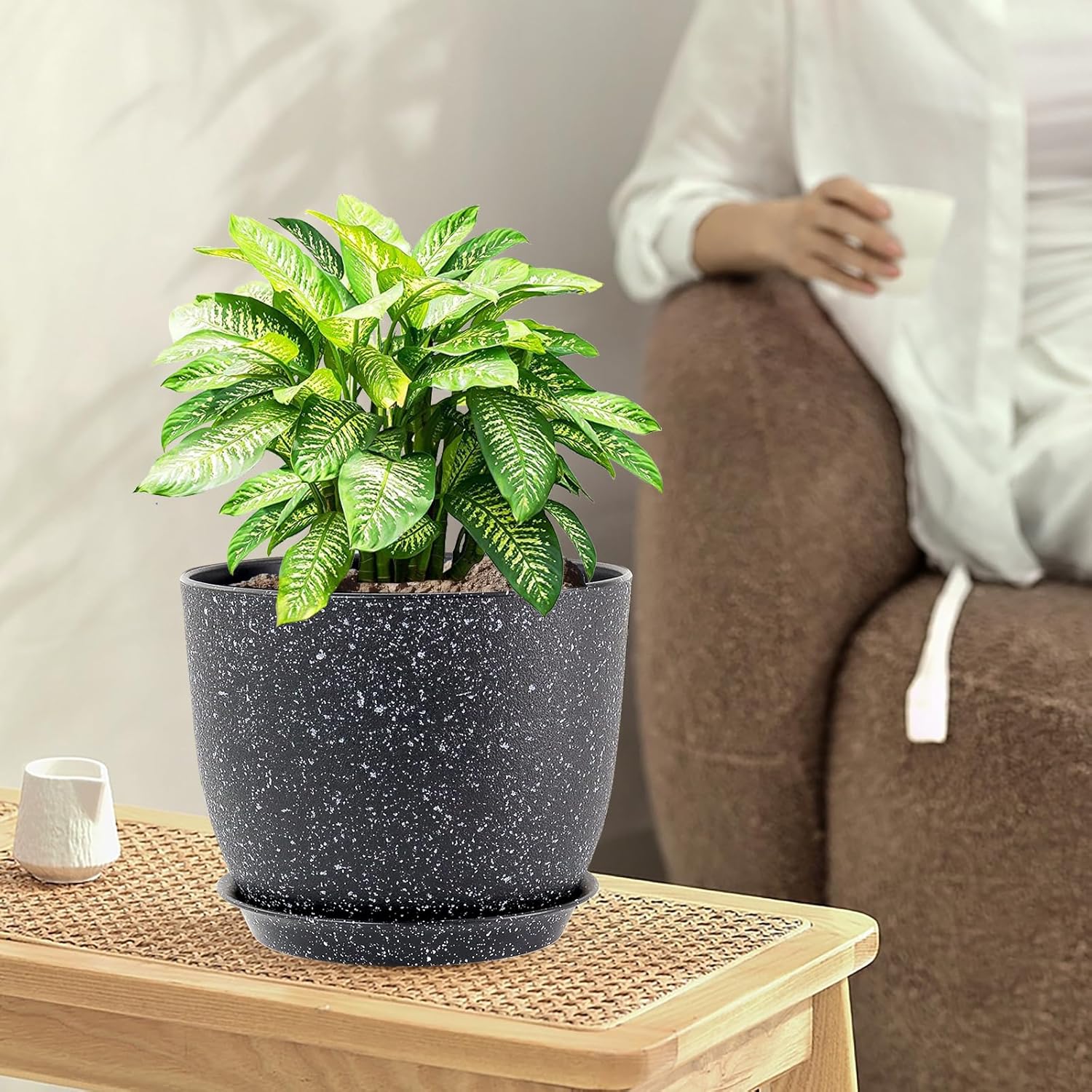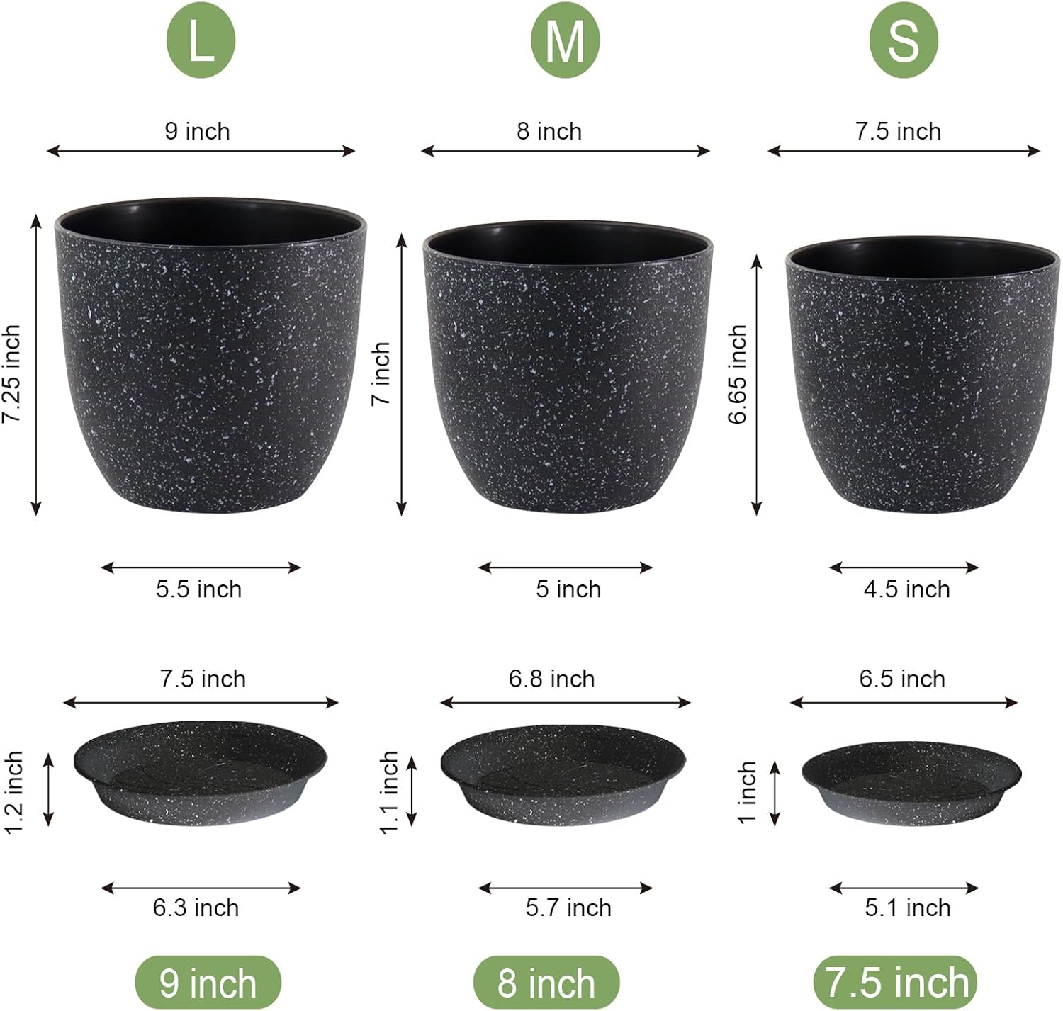 9/8/7.5 inch Plant Pots, Set of 3 Modern Decorative Plastic Planters with Drainage Holes and Saucer for Garden House Plants, Flower Pots for Indoor Outdoor Plants, Speckled Black