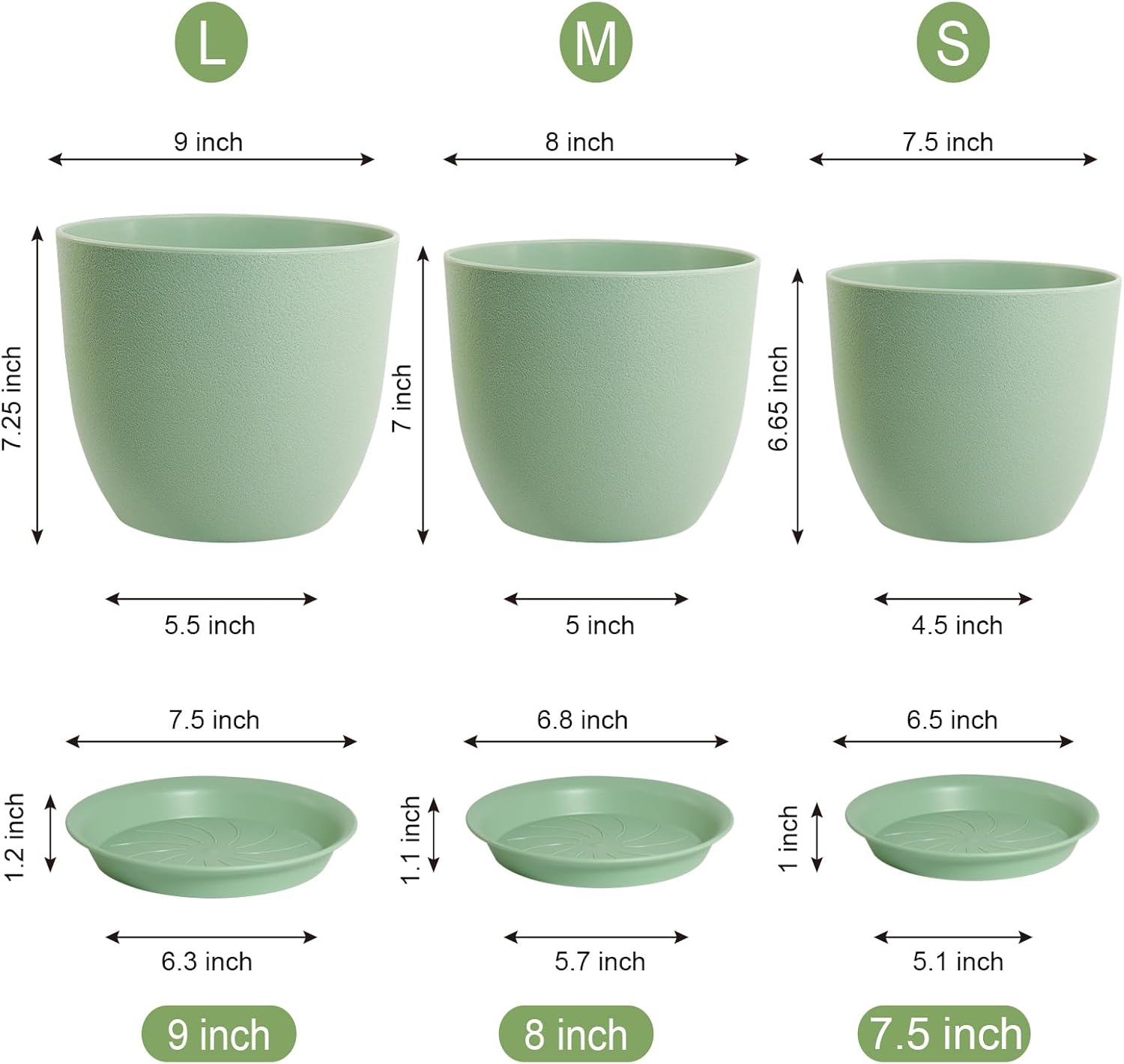 Flower Pots 9/8/7.5 inch, Plant Pots for Indoor Outdoor Plants, Set of 3 Modern Decorative Plastic Planters with Drainage Holes and Saucers for Garden Porch House Plants, Green