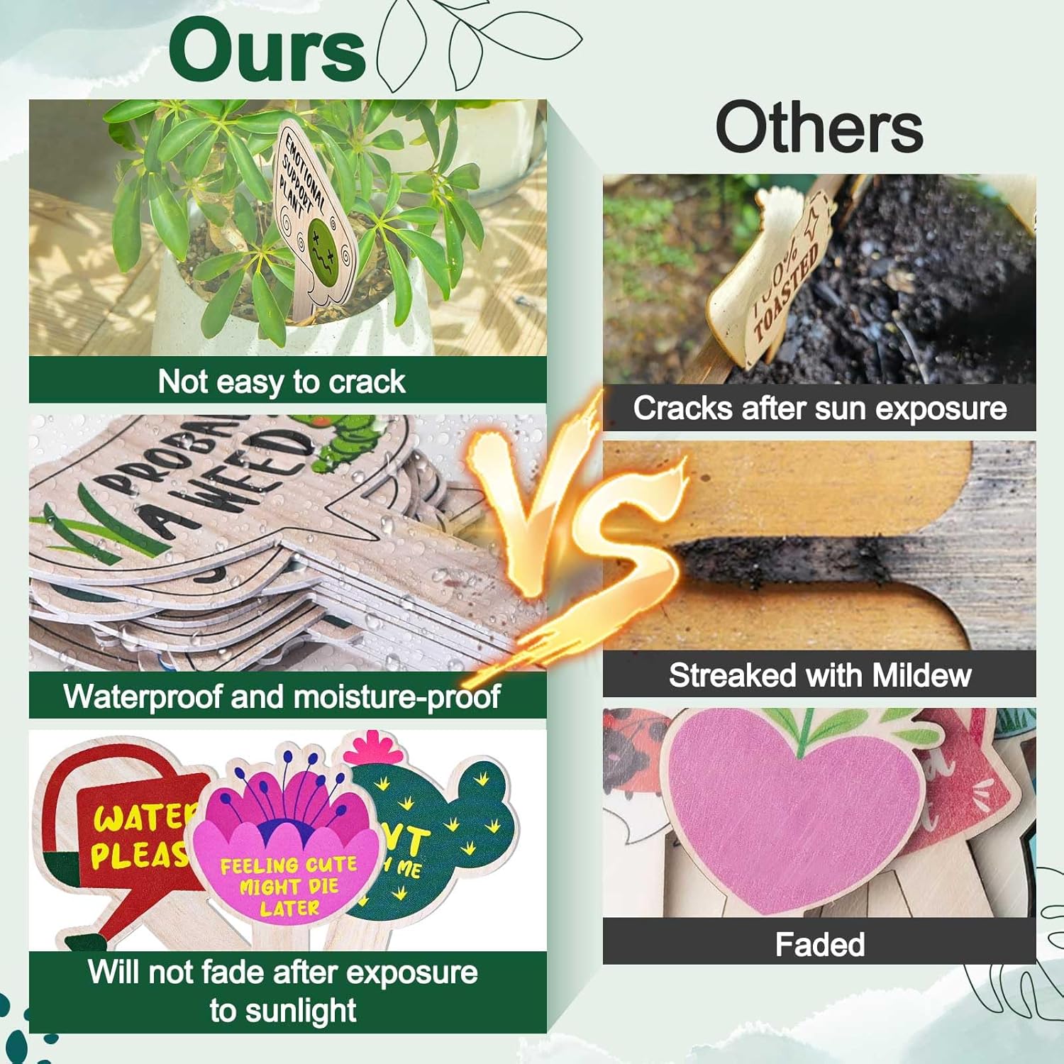 - 🌱Sturdy Material - JUYRLE plant markers are made of high-quality material, lightweight, waterproof and moisture-proof, have good toughness, and are not prone to black spots in wet soil. High quality printing that won't fade easily and will stand the test of time.