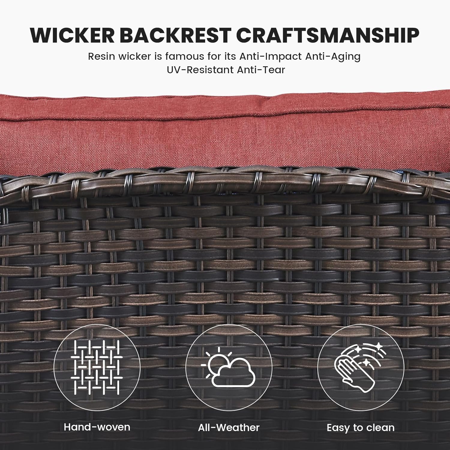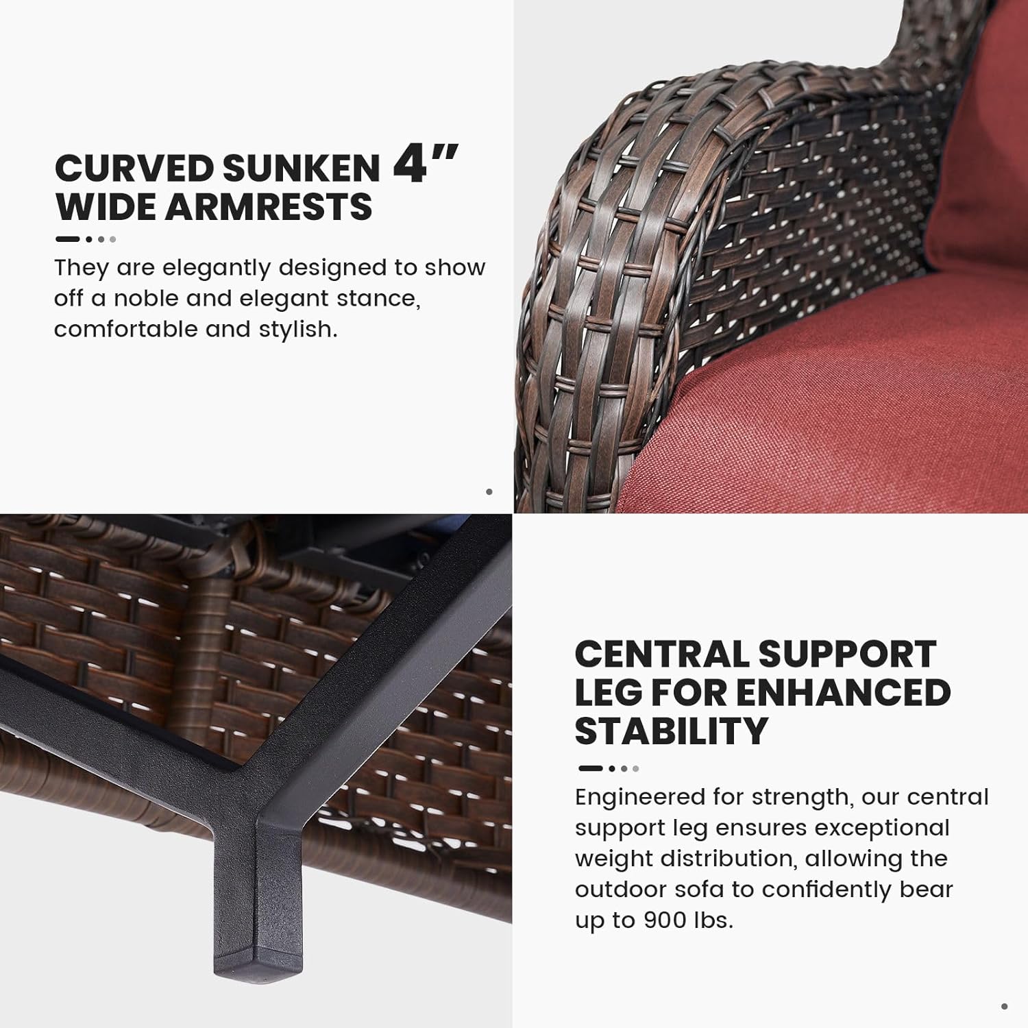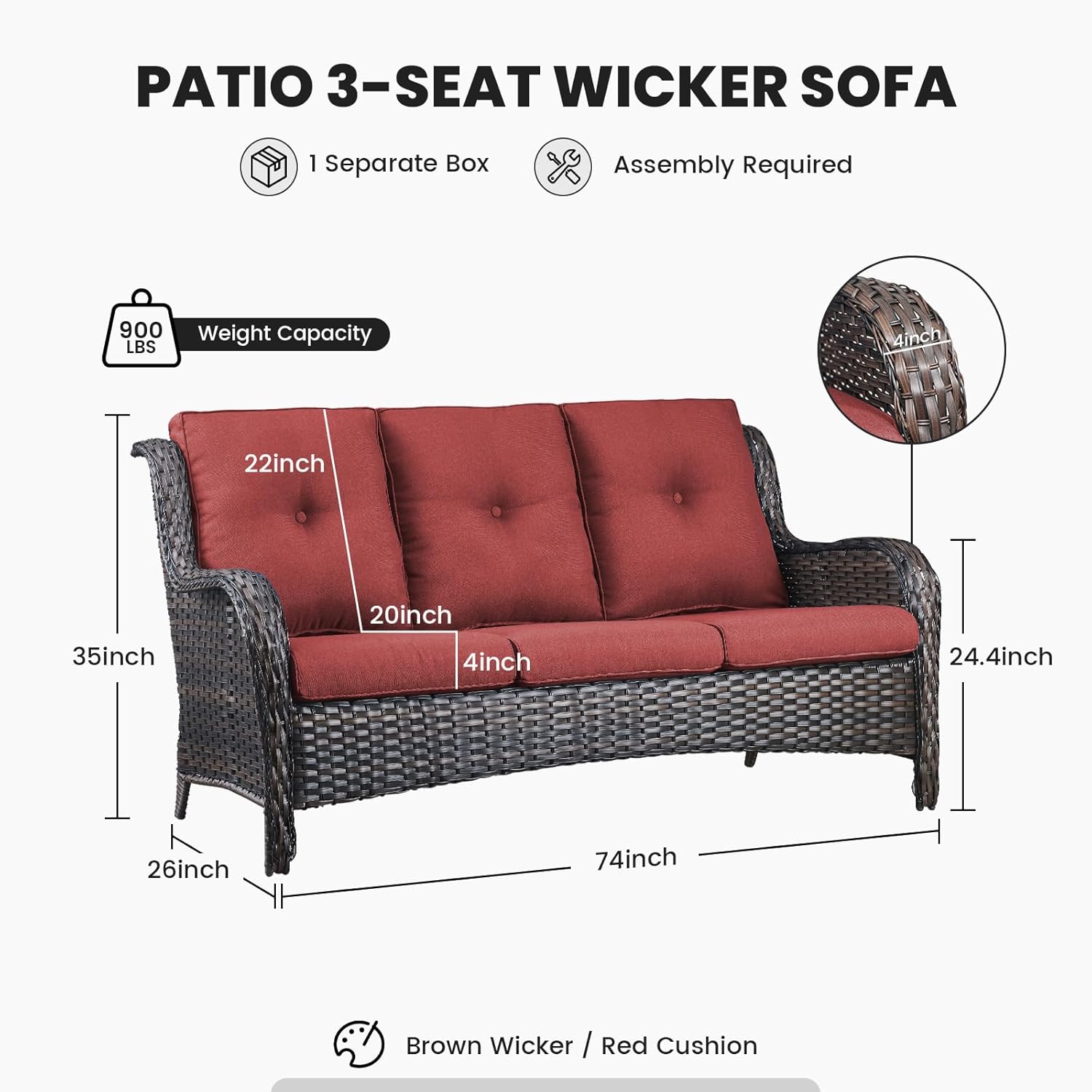 - PATIO WICKER SOFA DETAIL :The outdoor 3-seater sofa includes hand-woven brown/grey wicker and soft couch red cushions. The dimensions are L75* W 35* H 35 inches, with a weight capacity of 750 LBS. Comes with clear furniture assembly instructions and all the tools needed for easy assembly by 1 person.