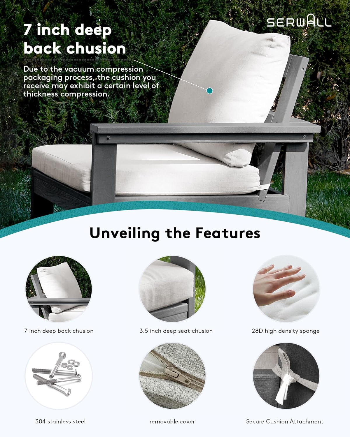 - Enhanced Comfort: Our patio sofa set features premium, 3.5-inch thick high-density foam cushions, providing unparalleled comfort and support during those long hours of relaxation or socializing. With an extra thick 7-inch pillow for the backrest, you can rest assured that your seating experience will be nothing short of luxurious.