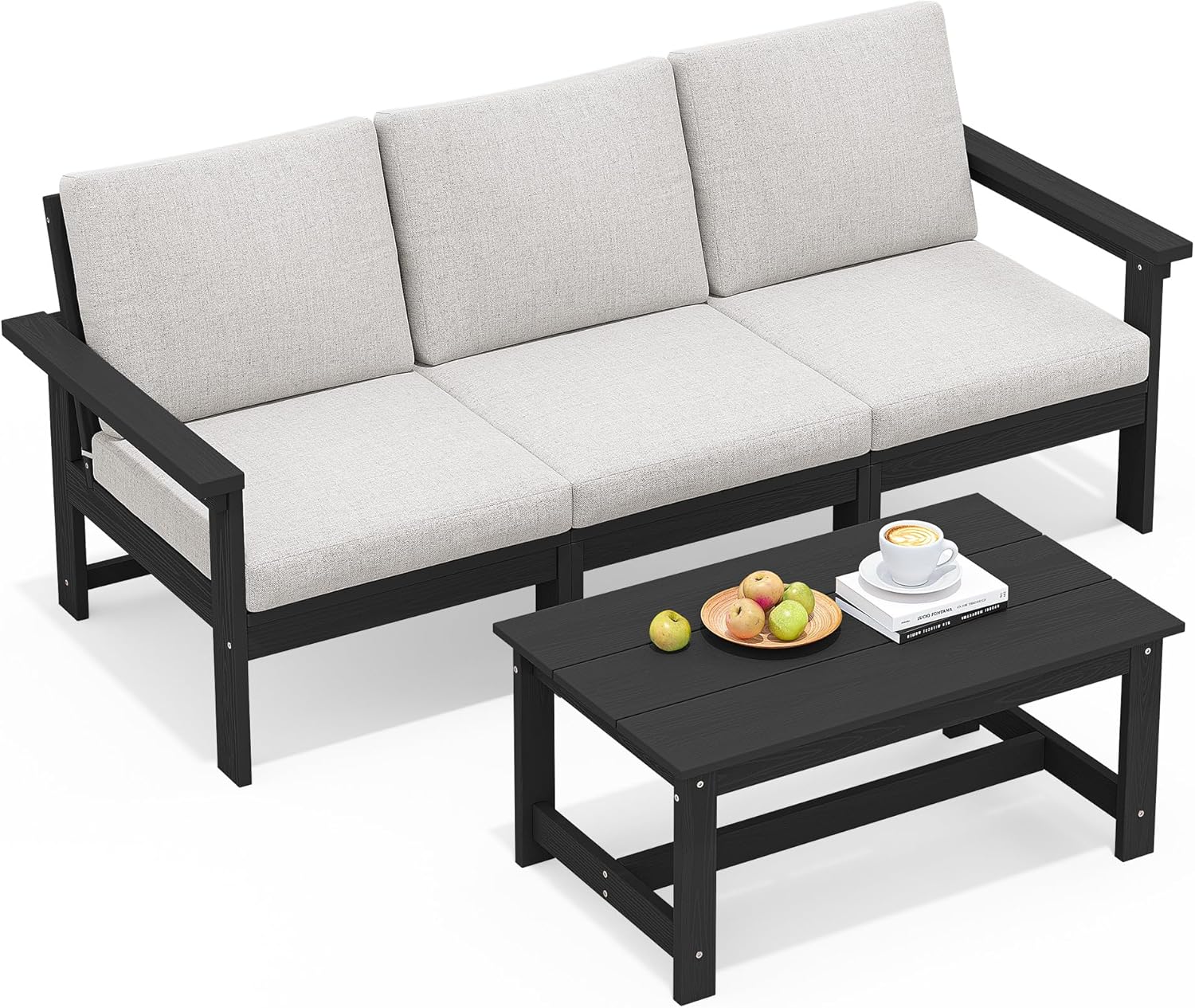 SERWALL HDPE Patio Sofa Set, 4-Piece Sectional Outdoor Furniture Set, All Weather Outdoor Couch Set Patio Furniture Set for Deck, Lawn, Black Frame with Khaki Cushion