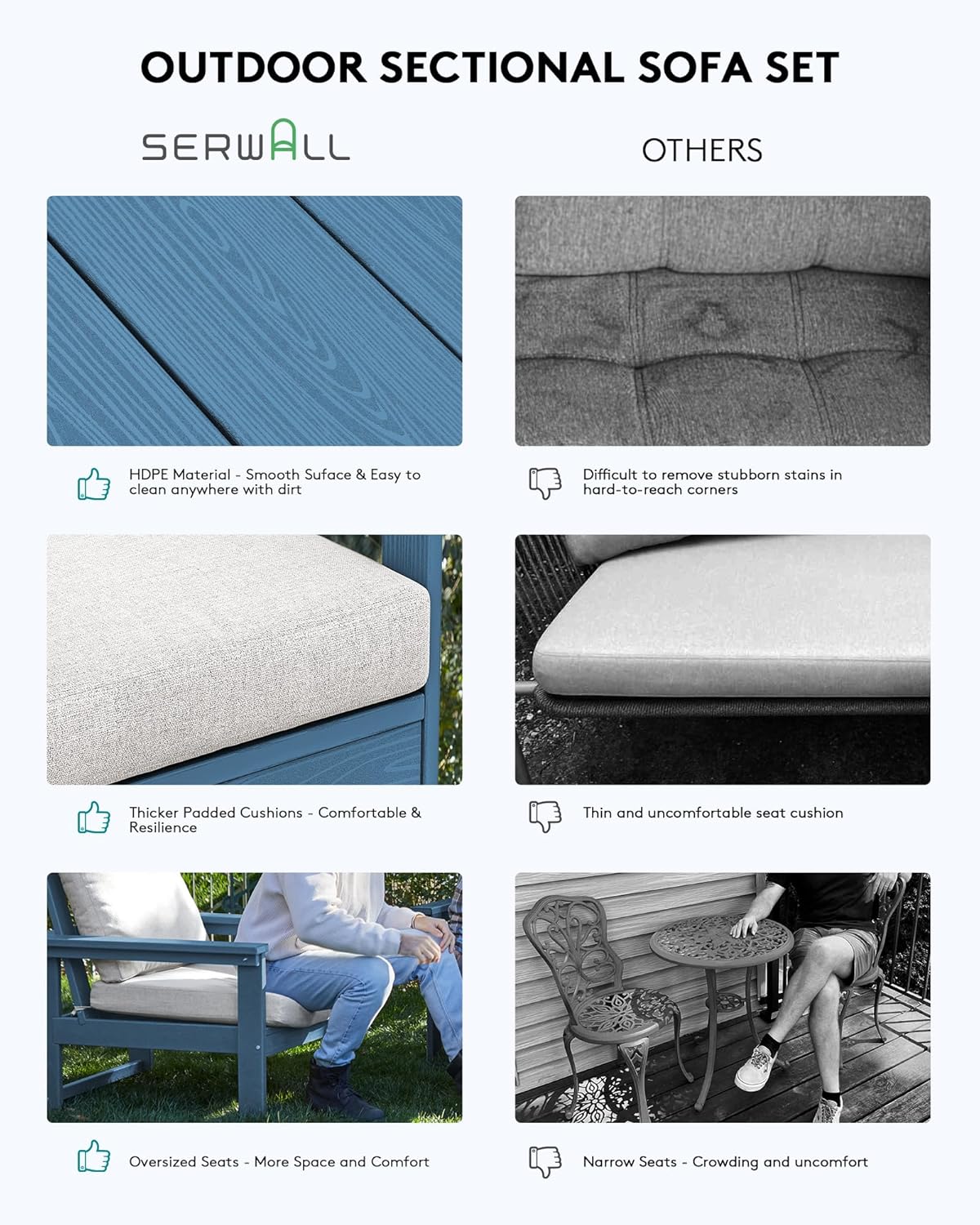 - Enhanced Comfort: Our patio sofa set features premium, 3.5-inch thick high-density foam cushions, providing unparalleled comfort and support during those long hours of relaxation or socializing. With an extra thick 7-inch pillow for the backrest, you can rest assured that your seating experience will be nothing short of luxurious.
