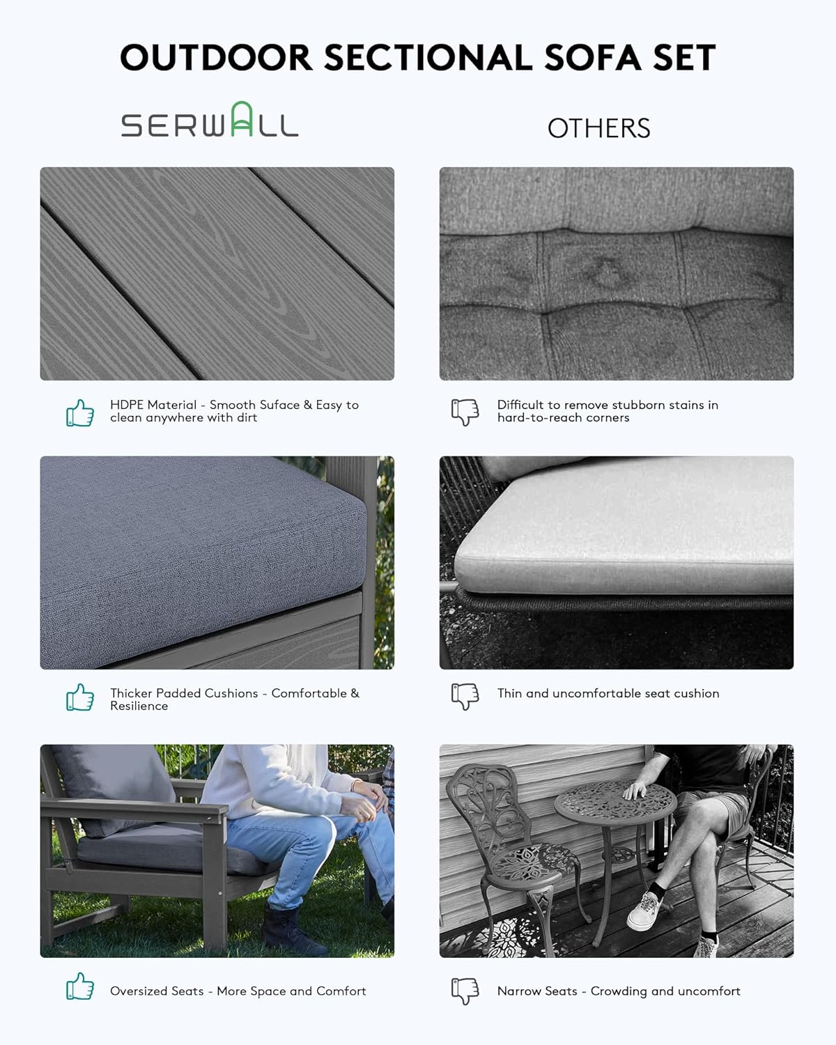 SERWALL HDPE Patio Sofa Set, 3-Piece Sectional Outdoor Furniture Set, All Weather Outdoor Couch Set Patio Furniture Set for Deck, Lawn, Grey Frame with Grey Cushion