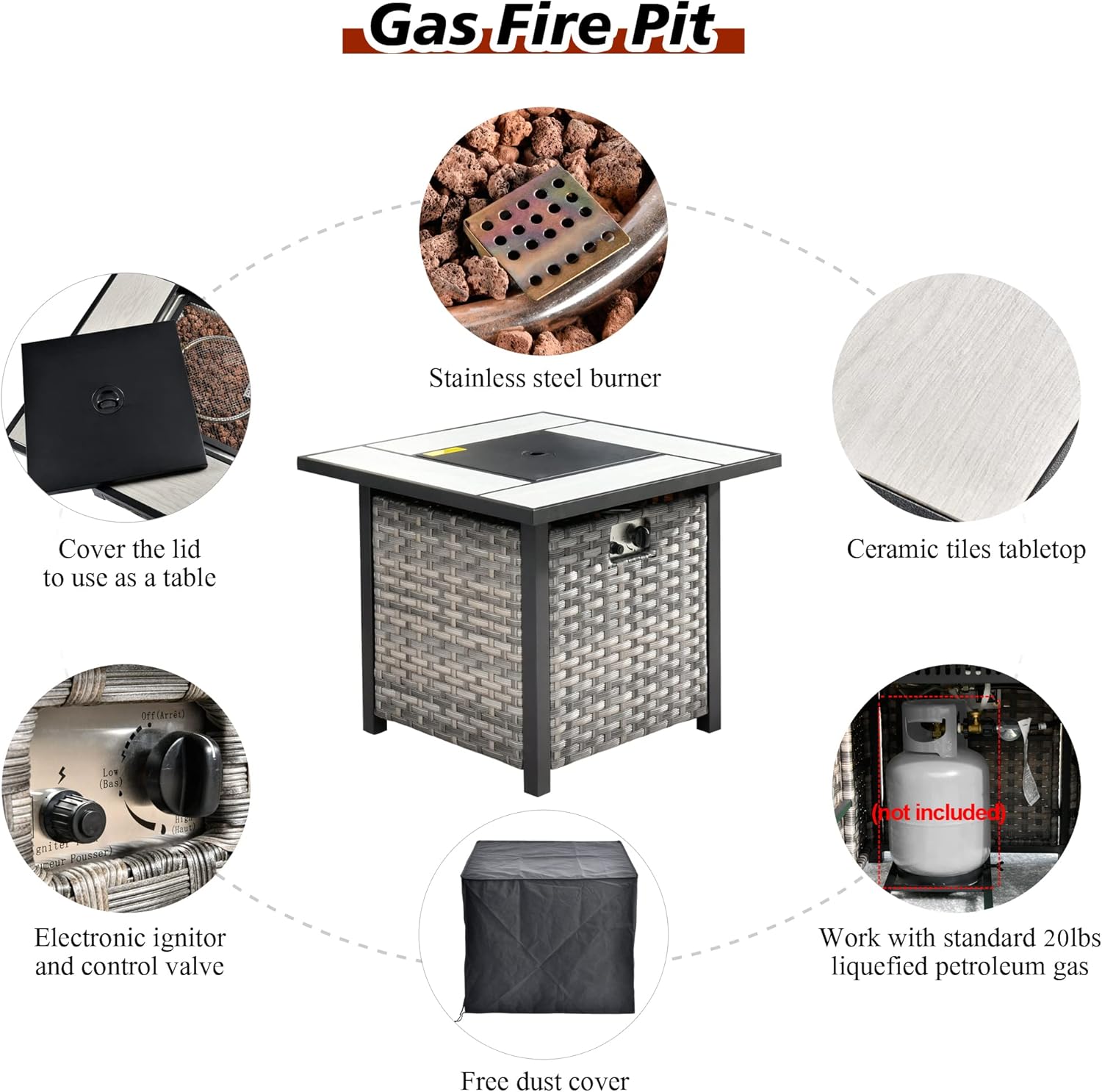 - FirePit Table Included: Comes with a square convertible propane gas fire pit table. Night time use it as a fire pit table to add atmosphere. Day time use it as a tall Dining table with the burner lid. Stainless Steel Burner withstands all weather. CSA certificated for safety.