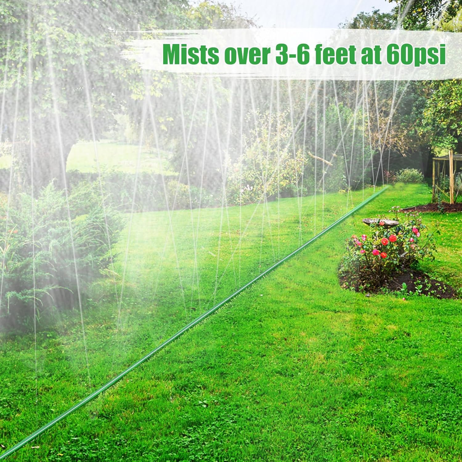 - Efficient Water Conservation: With its unique three-tube design and small holes, this sprinkler hose provides efficient and water-saving irrigation. It mists over areas 3-6 feet high at a normal water pressure of 60PSI, provides continuous gentle spray coverage, and helps you maintain a green and healthy lawn or garden while conserving water.