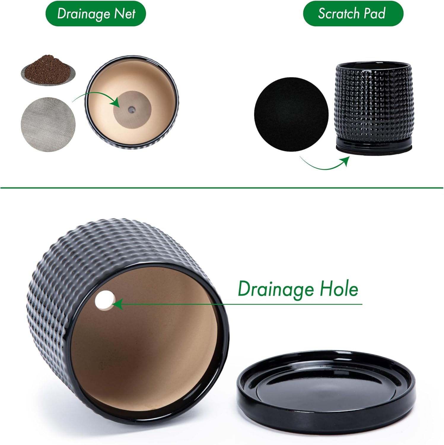 - >> Drainage Net and Pad - A stainless-steel drainage mesh net is also included to prevent soil from falling off the pot. Another protective pad is included to protect tabletop wood surface from scratches.