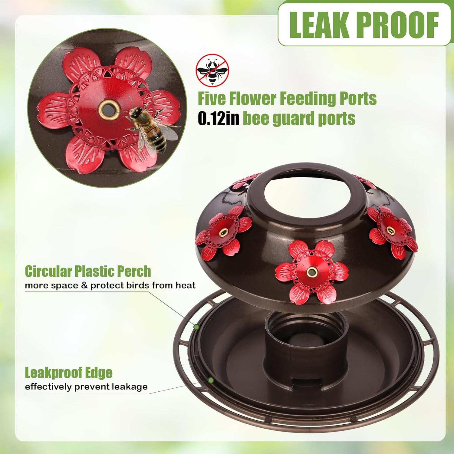 - Ample Feeding Space: Five flower shape feeding prorts are perches arranged in a circular manner for several humming birds dine and rest at the same time. Upgraded glass hummingbird feeder with 22 oz nectar capacity have perfect size to keep nectar fresh