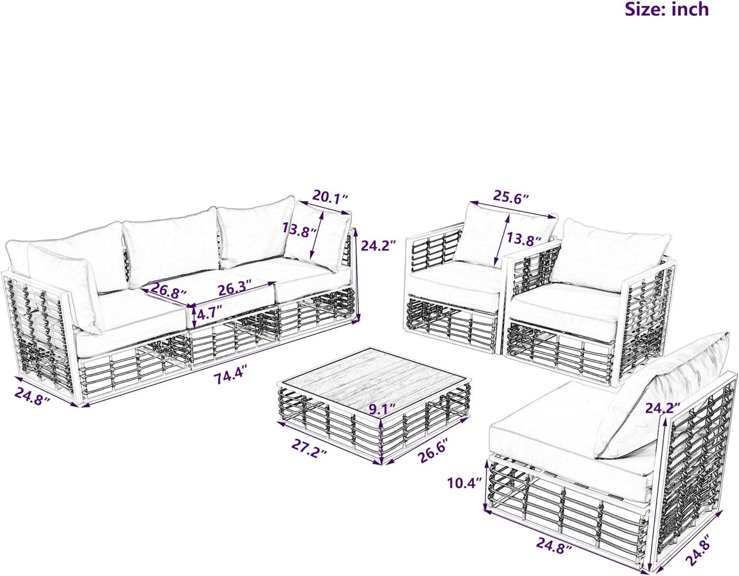 - π[Easy Assembly] - Each order comes with a clear and detailed assembly instruction guide and all necessary tools are provided to get your set assembled in no time. If you have any questions, please feel free to contact us, we will reply you as soon as possible. Single Sofa: 24.8x24.8x24.2inch(LXWXH); Coffee Table:27.2x26.6x9.1inch(LXWXH); Seat Cushion:26.8x26.3x4.7inch(LXWXT); Back CushionοΌ25.6x13.8x7.1inch(LXWXT); Side Pillow: 20.1x13.8x7.1inch(LXWXT).