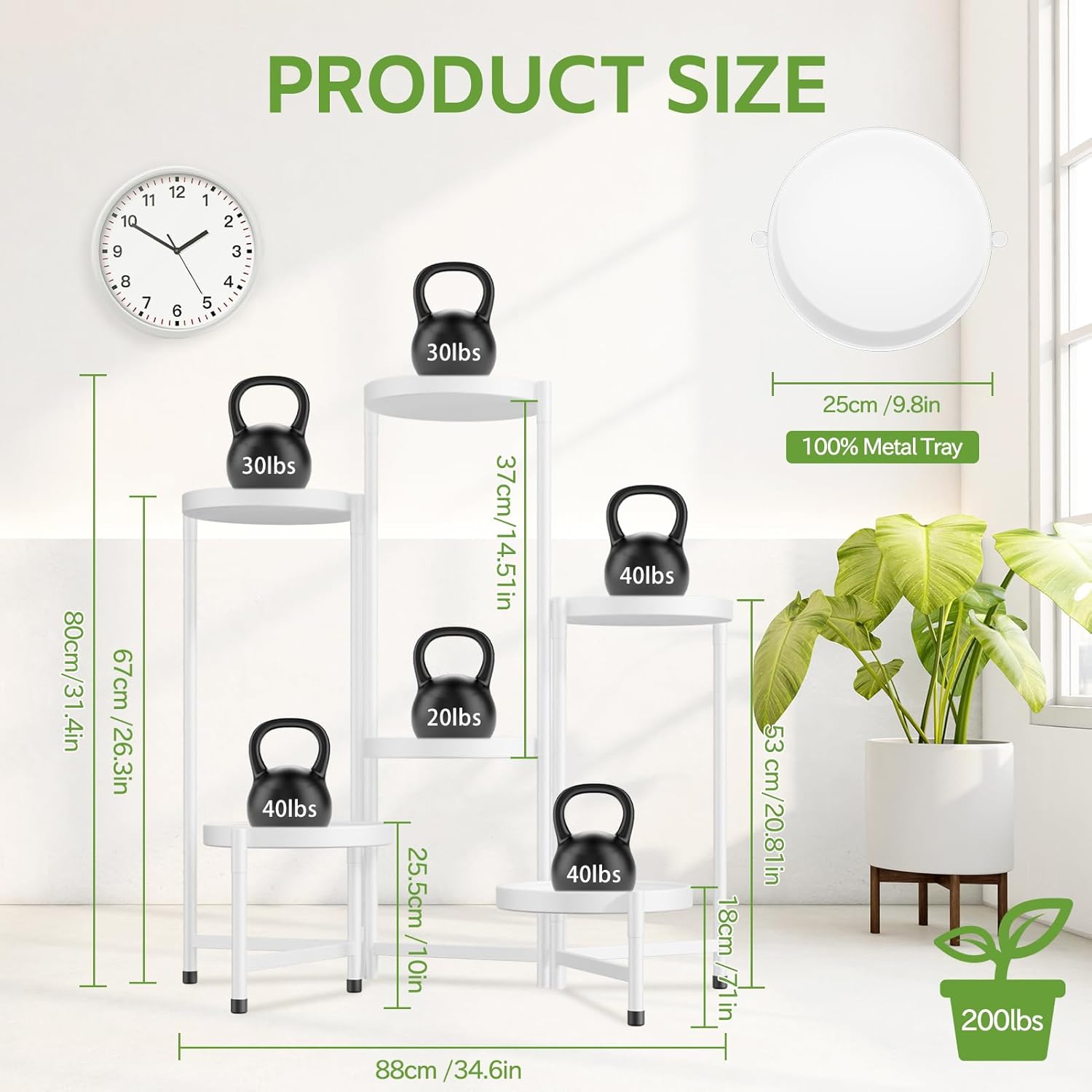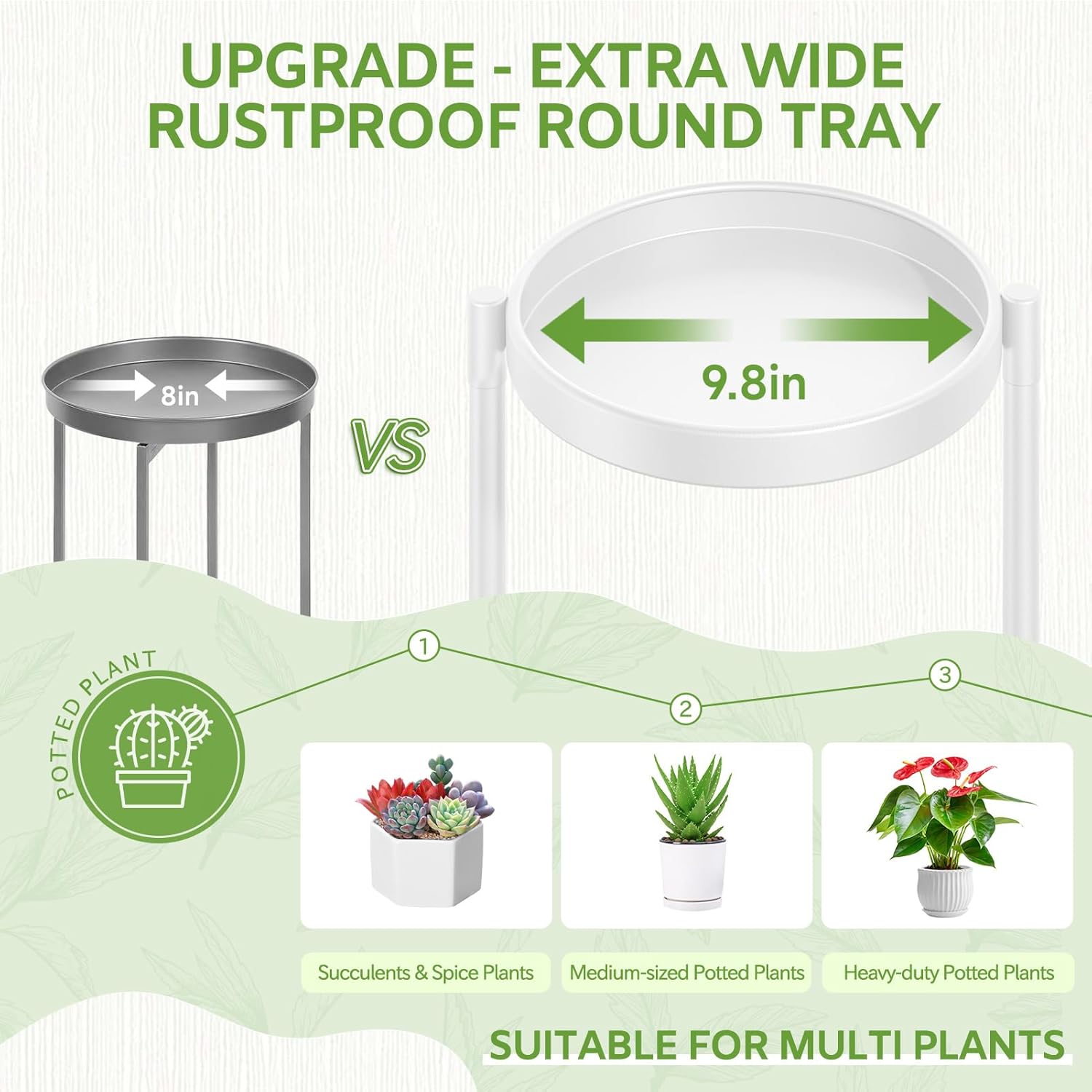 - 9.8 In Extra Wide Round Tray: This corner plant stands for indoor plants has been upgraded with an enlarged 9.8-inch diameter metal round tray with a total weight capacity of 138 lbs for large & heavy duty potted plants. The tiered plant stand is made of sturdy and durable iron with a waterproof and rustproof white lacquer finish, making it suitable for indoor and outdoor use