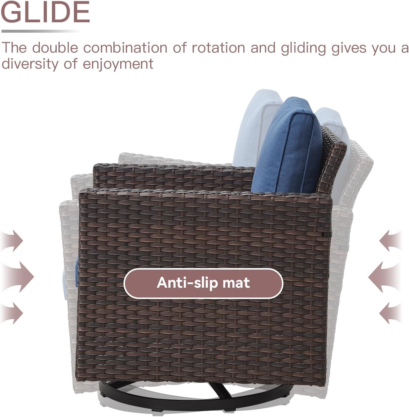 - 360ยฐSwivel Glider Rocker Chairs: Design of rotating 360 degree,swinging back and forth,You can easily turn your face away from the sun without moving the entire chair, or swing your seat like a cradle for the ultimate relaxation while listening to music or watching your children play outside.