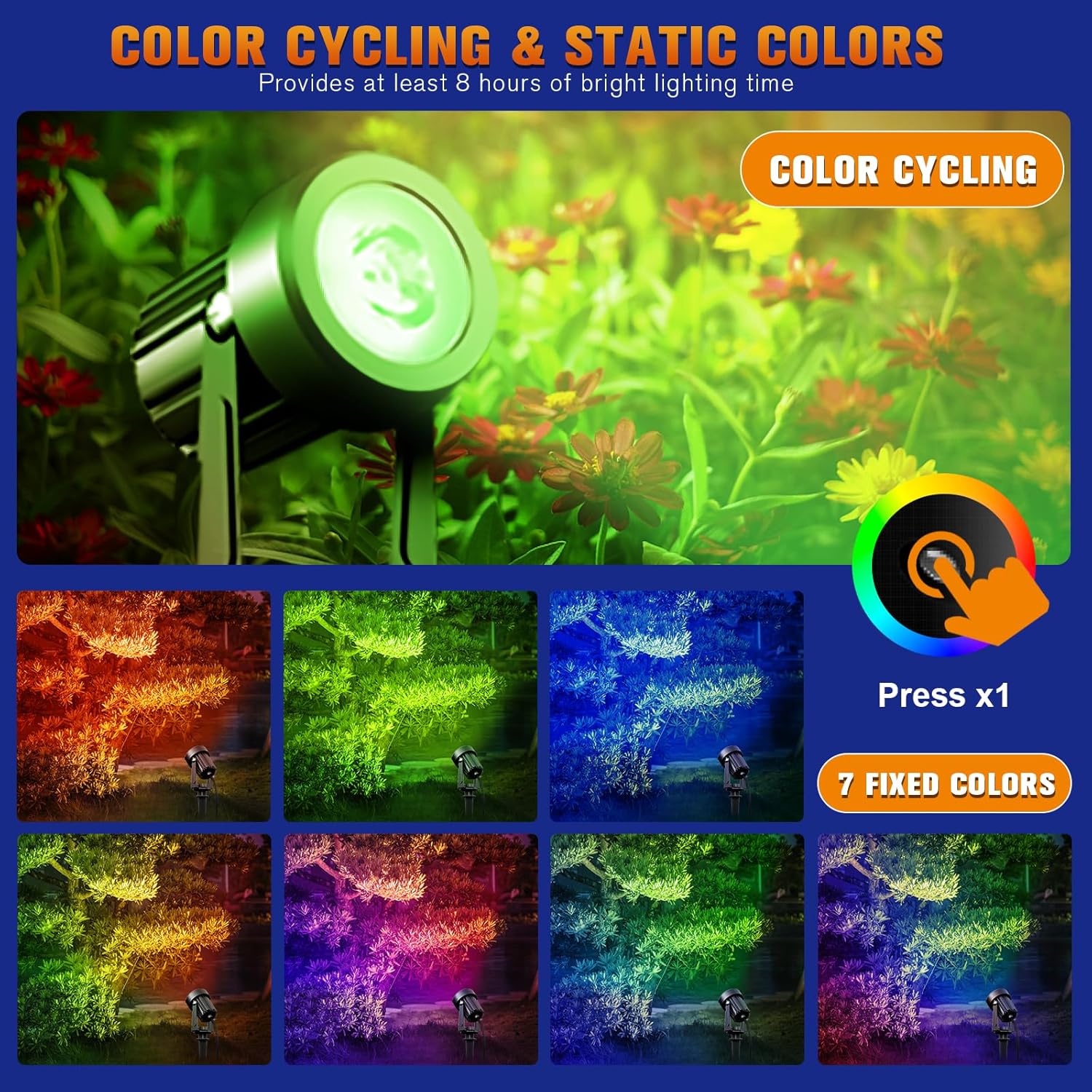 - 【RGB Solar Spotlights】Long press to turn on solar color changing lights outdoor with removable solar panel, switch between the two modes:colorful lights are great for Christmas and Halloween,but also for everyday decoration of your palm trees, gardens, walls and more