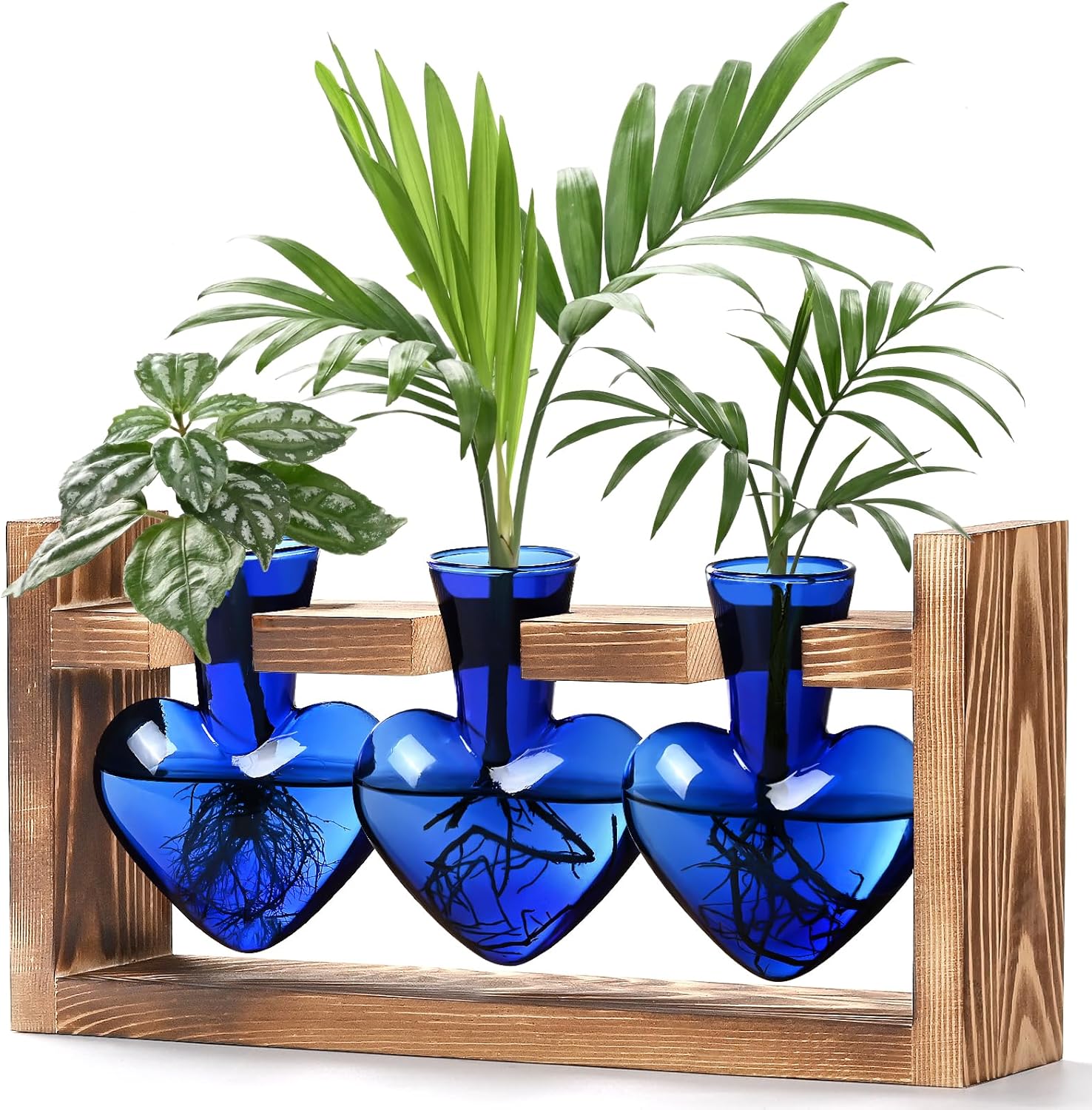 Lifecapido Heart Shaped Propagation Stations, Plant Terrarium with Wooden Stand, Plant Propagation Station for Hydroponics Plants Office Garden Home Decor, Gifts for Women Plant Lover (3 Vases, Blue)
