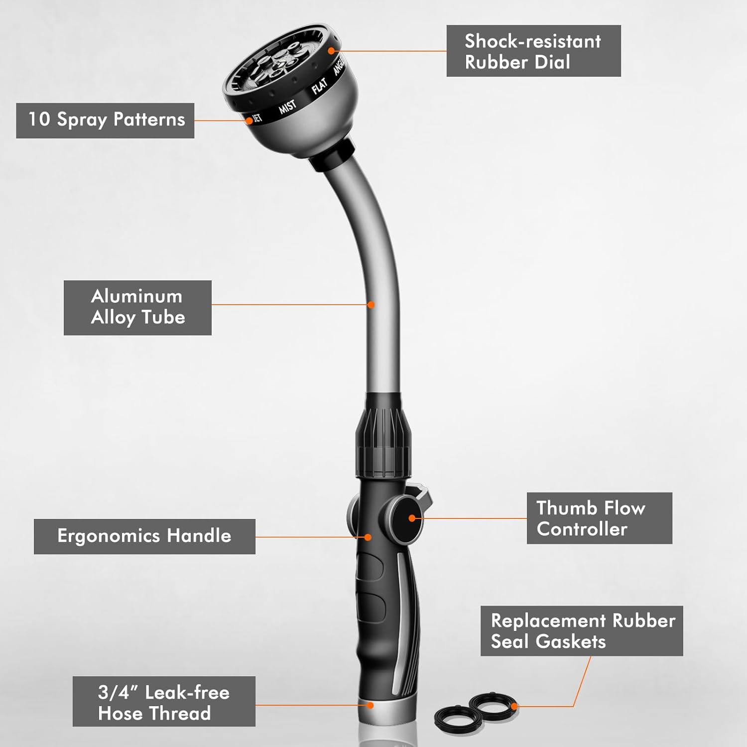 - 【Fits All Standard Garden Hoses】Threaded with the 3/4” Garden Hose Thread (GHT), this water hose wand fits all standard garden hoses. It is also equipped with rubber seal gasket, perfect to attach on your garden hose and provide an extreme water-tight seal, make the nozzle leak-free and save unnecessary water.