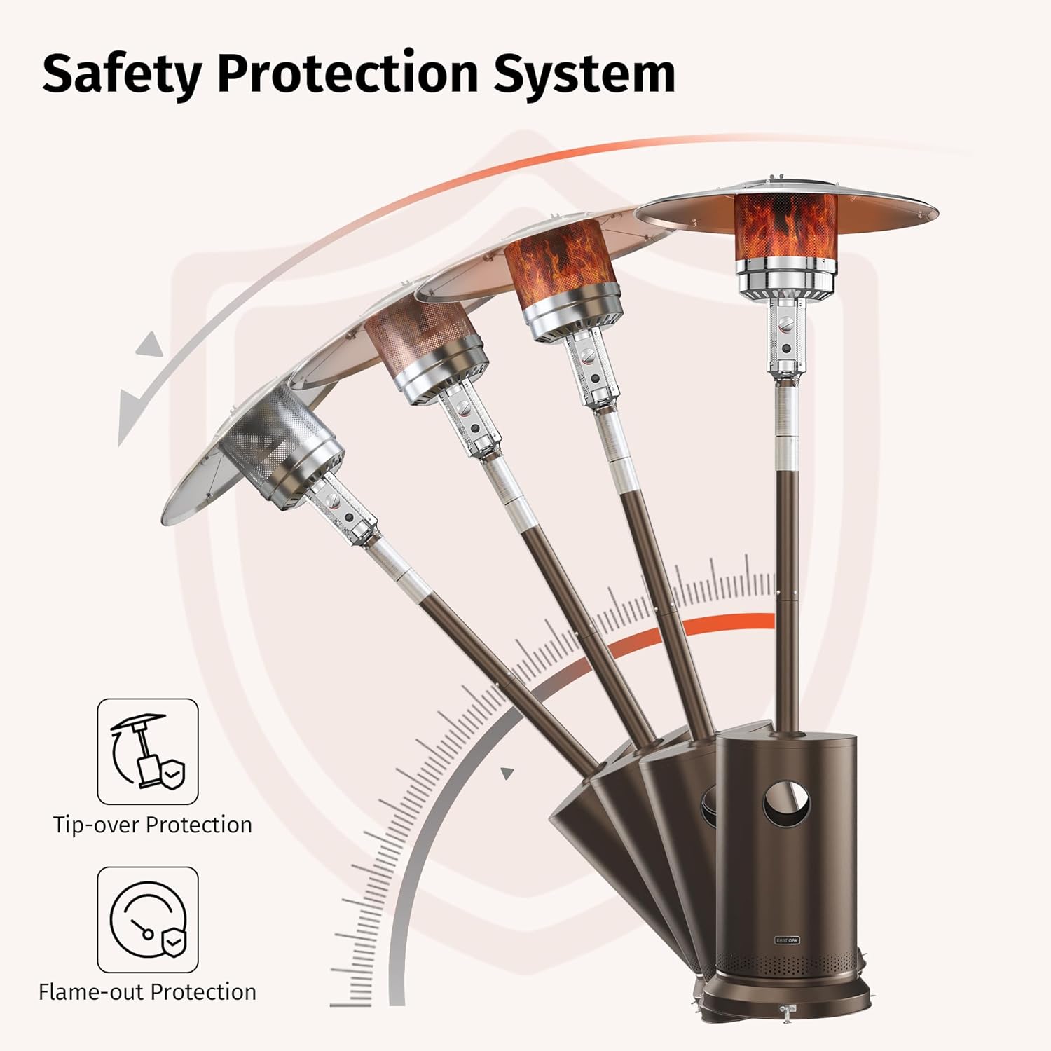 - šš¼ššÆš¹š² š¦š®š³š²šš š£šæš¼šš²š°šš¶š¼š» š¦šššš²šŗ: The Tip-over Protection system will shut off the flame when the patio heater propane is tilted more than 45 degrees. If the flame goes out, the Flame-out Protection system automatically shuts off the gas supply
