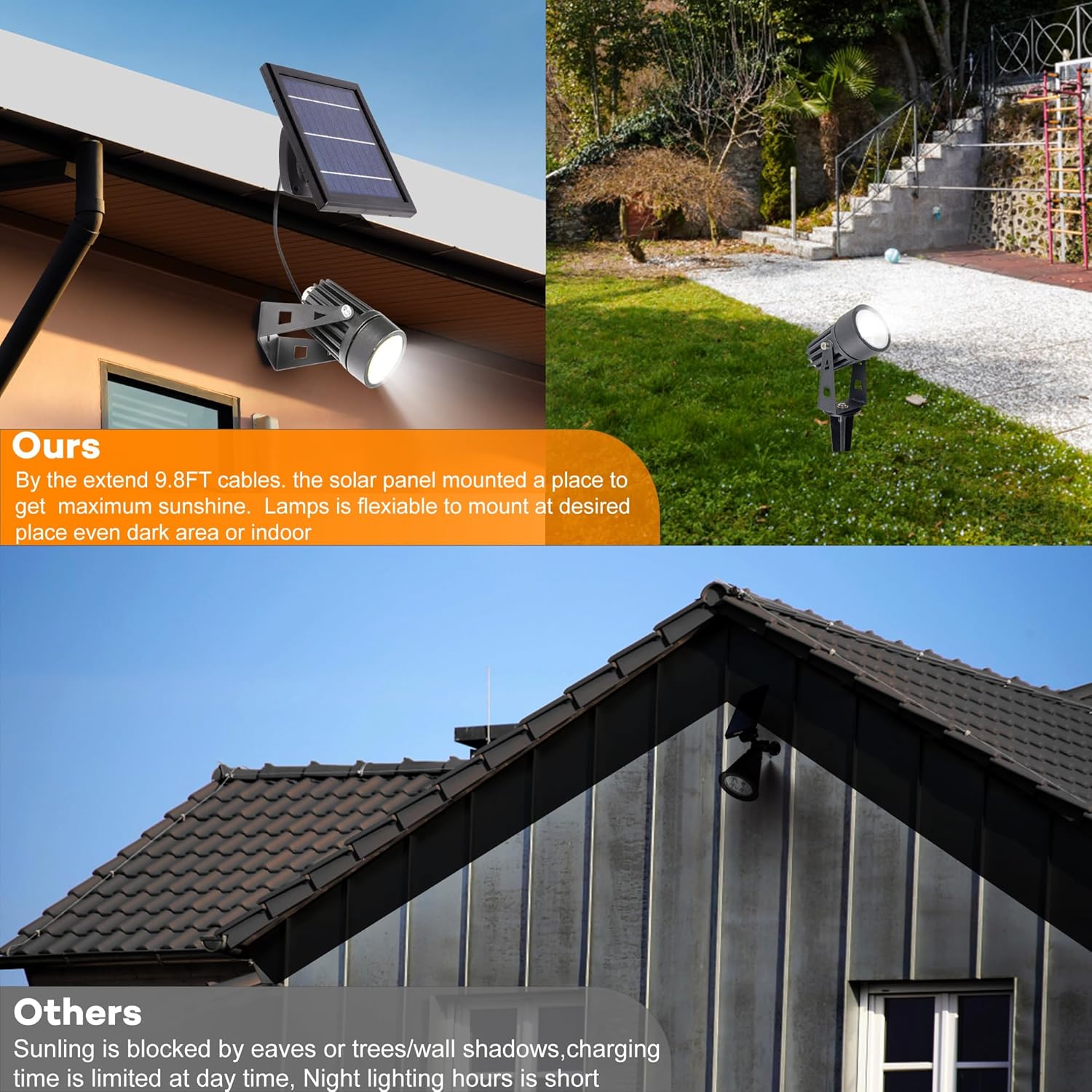 - SEPARATE SOLAR PANEL 10Ft Extension Cables to Let You PLACE The Metal Spotlights at Favorite Places Even NO SUNSHINE. Two-Ways Installations :Stake-to-Ground OR Wall-Mounted with Mechanical Fasteners to Create Soft Downlight / Uplight Ascend