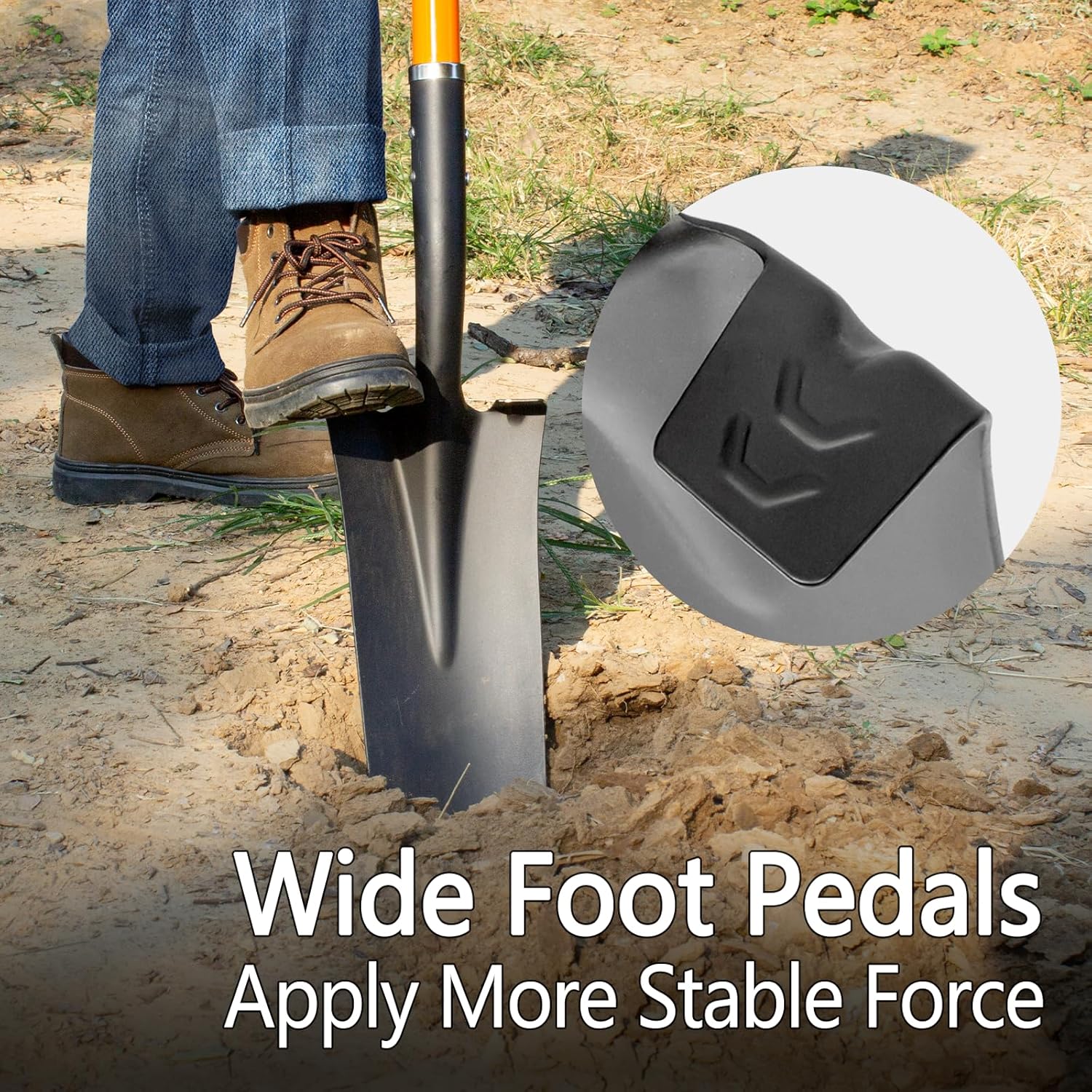 - Ergonomic, Full Size: The shovel for digging is 58 inches in overall length and weighs 4 pounds, suitable for adults, the full size heavy duty shovel effectively reduces the bending angle of the waist when using it and reduces the pressure on the back, the head of the metal shovel with wide foot pedals makes applying force easier and improves the efficiency of digging.