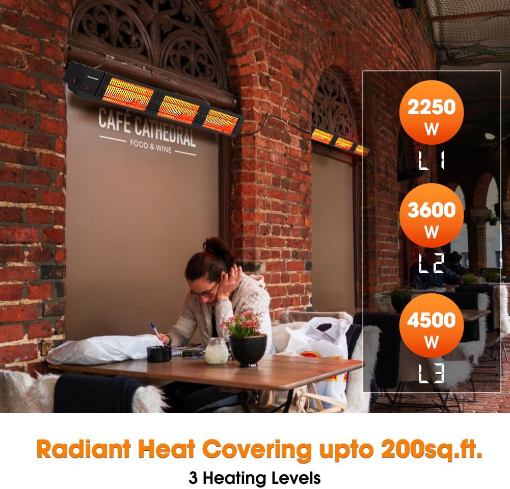 - 3 SECONDS INSTANT HEAT - This infrared patio heater with carbon fiber heating tube delivers instant powerful heat, only warming people and solid objects directly and unaffected by wind, providing you with maximum comfort for your winter activity outdoor, perfect addition to your patio, deck, garage or workspace