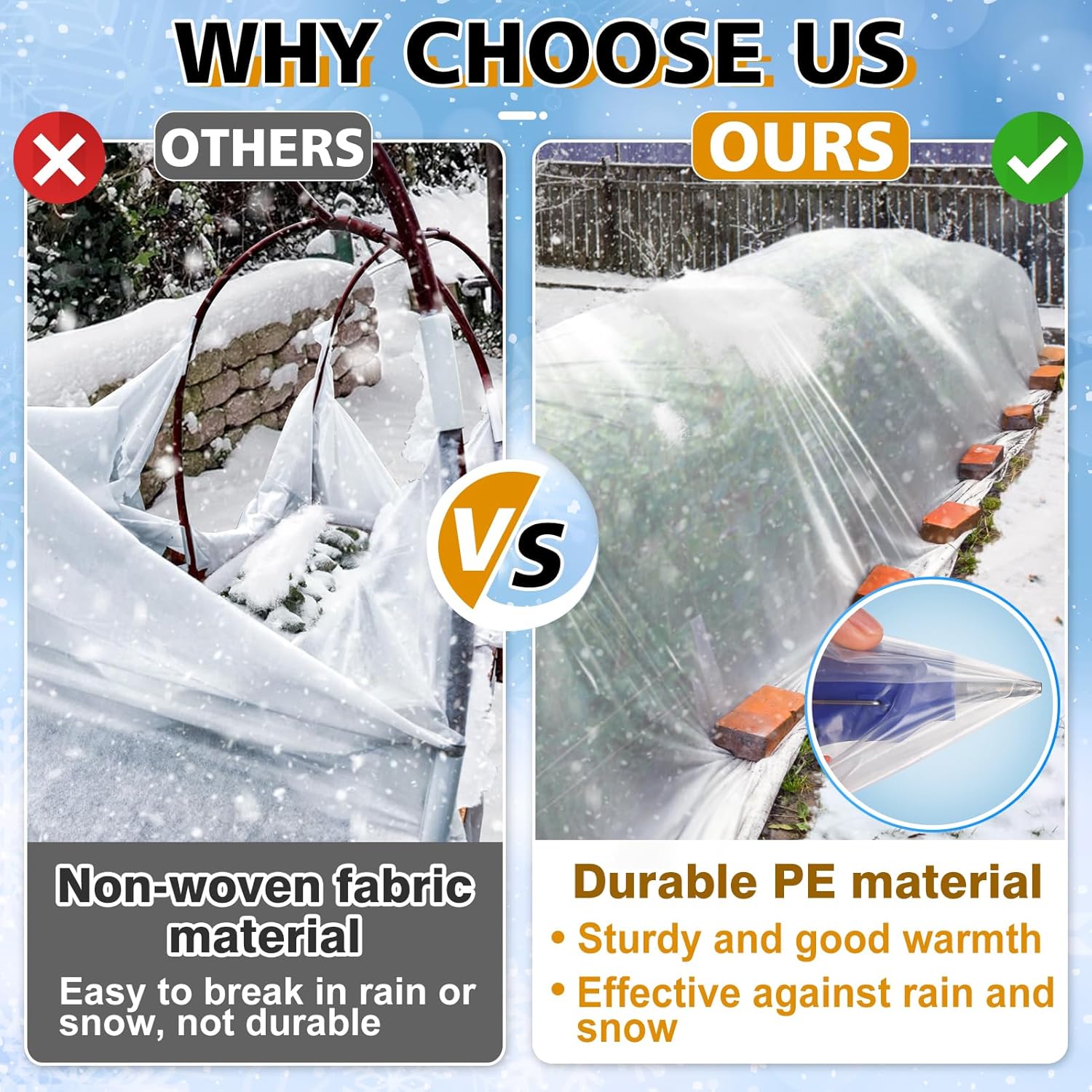 - Excellent Light Transmission: Our plastic sheeting is transparent, allowing light to pass through and ensuring plants receive ample sunlight for healthy growth. Additionally, the transparent cover provides visual access, enabling you to observe the frost protection effect on your plants.