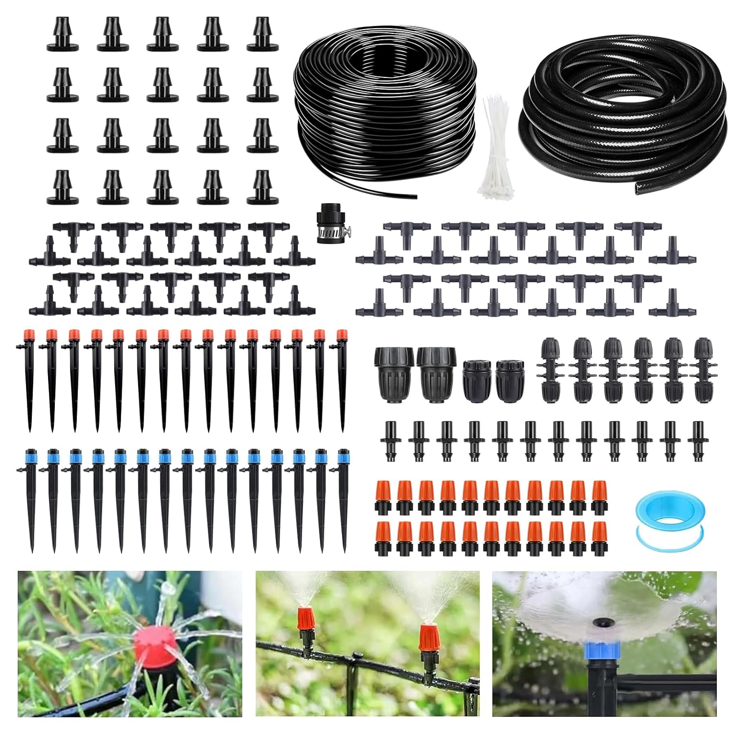 - 256FT Drip Irrigation Kit: Drip irrigation system, equipped with a versatile range of components, caters to all your garden watering needs. Includes essential parts such as 210ft 1/4'' irrigation tube, 46ft 1/2'' irrigation tube, 1/2‘’ Lock Barbed Tee connectors, drip emitter streams, vortex emitters, Blue Mist Nozzles, Quick connection tees, Faucet Connector, and more.