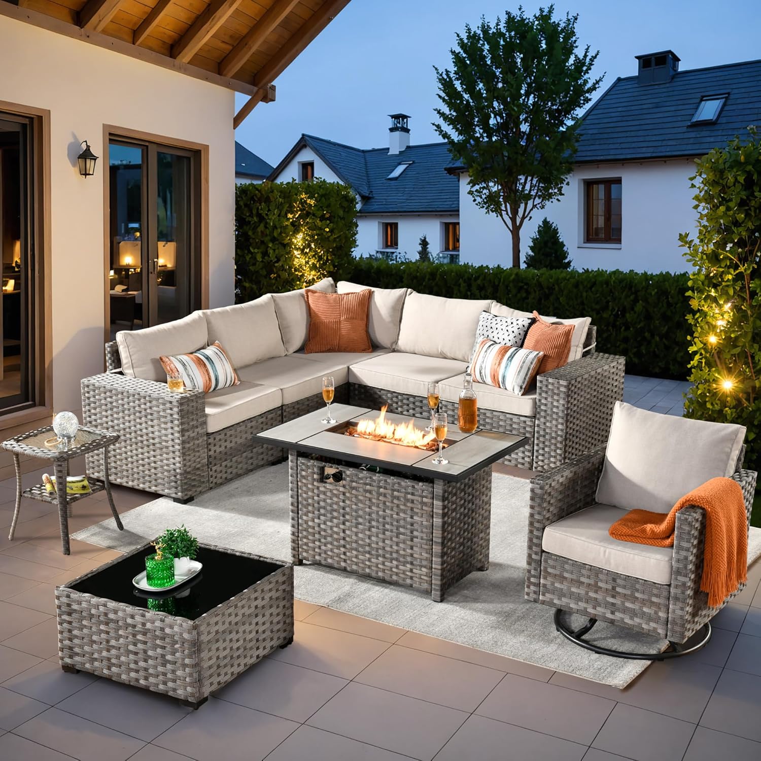 ovios 9 Pieces Patio Furniture Set, Outdoor Wicker Sectional Sofa with 42" Fire Pit Table Swivel Chair, Modern Modular Deep Seat Rattan Couch Conversation Sets, Beige