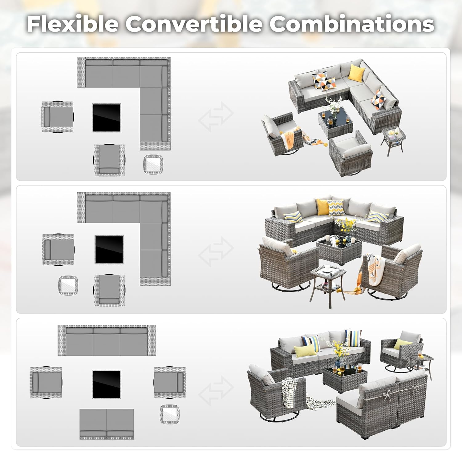 - Modular Combination: Outdoor sectional sofa set can be separated into 7 single seats, which can be freely combined with the included connecting clips to create the outdoor seating arrangement you want to fit into a variety of spaces.