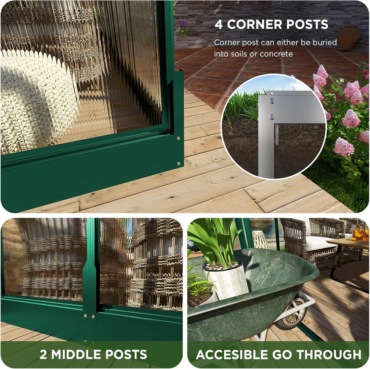 - Premium Material: This winter greenhouse is constructed with a high-quality aluminum frame and 4 corner posts & 2 middle posts help bury the greenhouse deep in soil or concrete, ensuring robustness. Snow Load Capacity:15.4 psf; Wind Rating: 56 mph