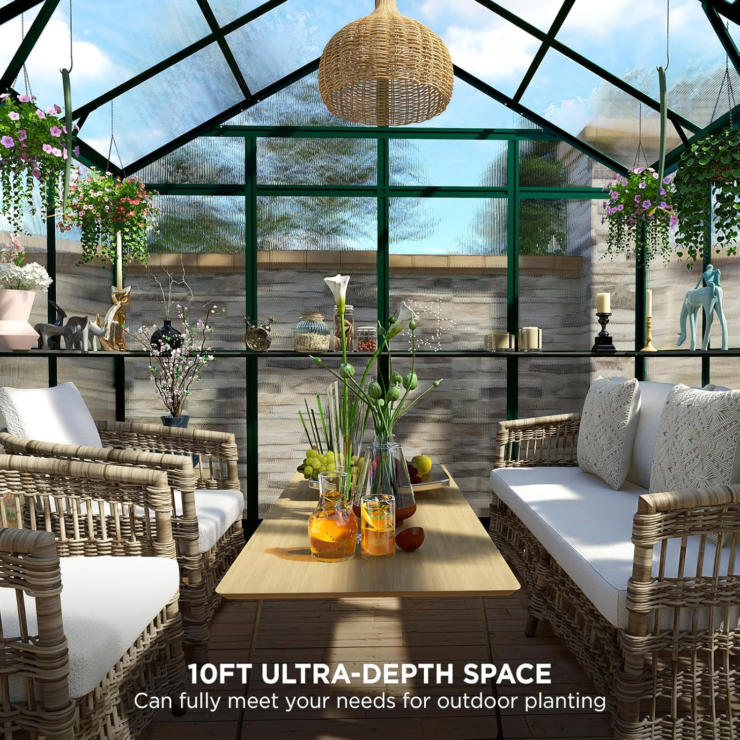 - 7.6x7.5x7.4 FT Large Greenhouse: Recommended foundation size: 8.6x8.5 FT. Designed with 6mm twin-wall translucent polycarbonate panels (99.99% UV protection)